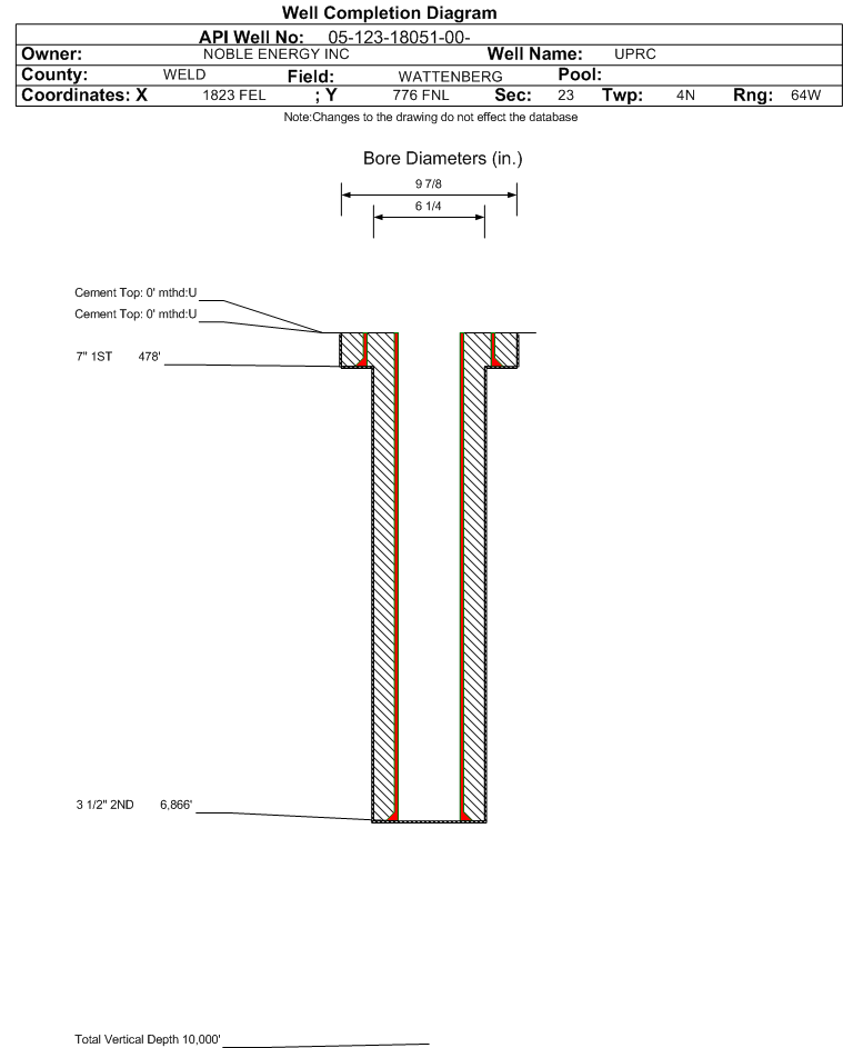 Wellbore #00 Wellbore Classification: OW Status: PA - 1/30/2024 Measured TD: 6876 ft. Vertical TD: 0 ft.| Wellbore Data for Original Wellbore | Wellbore Classification: OW PA - 1/30/2024 | | Wellbore Permit | | | Permit #: | 940211 | Expiration Date: | 8/24/1994 | | Proposed Depth/Form: | | | Surface Mineral Owner Same: | No | | Mineral Owner: | FEE | Surface Owner: | Not available | | Unit: | | Unit Number: | | | Formation And Spacing: | Code: CODL , Formation: CODELL , Order: 0 , Unit Acreage: 80, Drill Unit: W2NE |