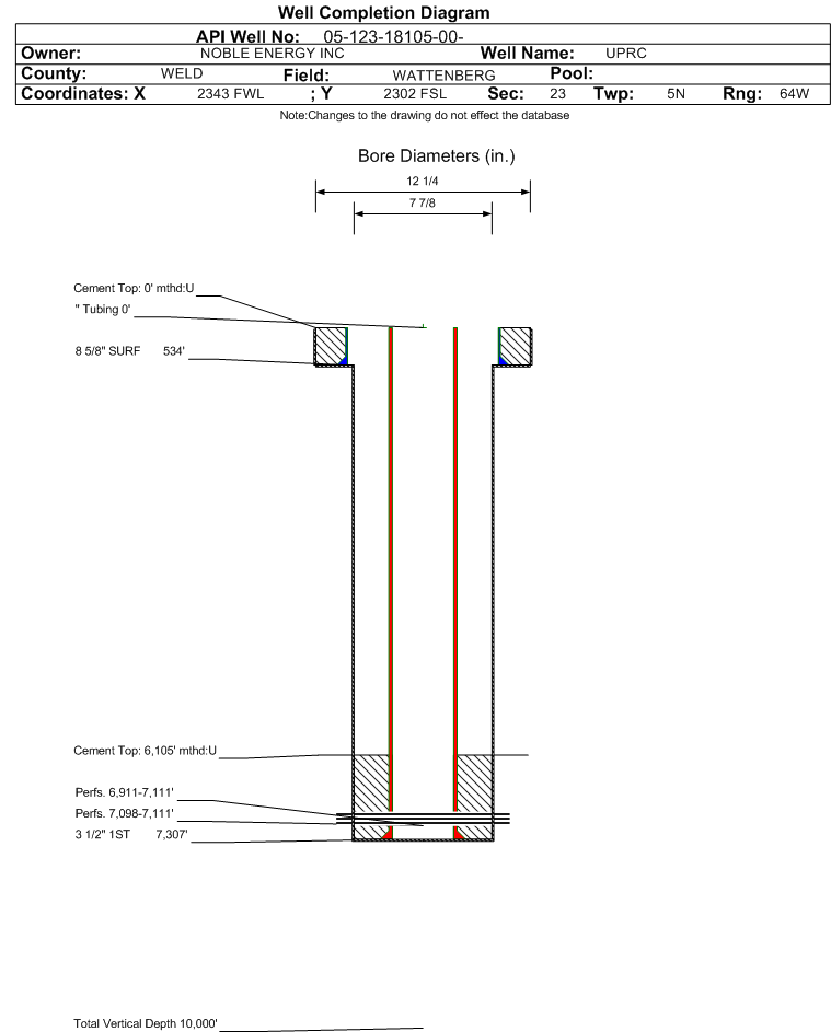 | Wellbore Completed | | Completion Date: | 3/31/1994 | | Measured TD: | 7330 ft. | Measured PB depth: | 7238 ft. | | True Vertical TD: | 0 ft. | True Vertical PB depth: | | | Casing: | String Type: SURF, Hole Size: 12.25 in., Size: 8.625 in., Top: 0 ft., Depth: 534 ft., Weight: 24 , Citings Type: ACTUAL | | Cement: | Sacks: 350, Top: 0 ft., Bottom: 534 ft., Determination Method: VISU | | Casing: | String Type: 1ST, Hole Size: 7.875 in., Size: 3.5 in., Top: 0 ft., Depth: 7307 ft., Weight: 7.7 , Citings Type: ACTUAL | | Cement: | Sacks: 200, Top: 6105 ft., Bottom: 7307 ft., Determination Method: CBL | | Formation | Interval Top | Log Bottom | Cored | DSTs | | PARKMAN | 3396 ft. | | | | | SUSSEX | 3890 ft. | | | | | NIOBRARA | 6837 ft. | | | | | FORT HAYS | 7072 ft. | | | | | CODELL | 7096 ft. | | | |