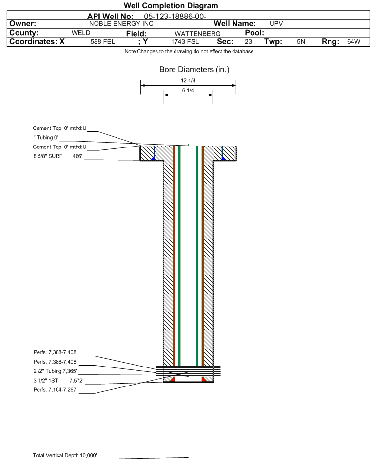 | Wellbore Completed | | Completion Date: | 5/3/1995 | | Measured TD: | 7594 ft. | Measured PB depth: | 7515 ft. | | True Vertical TD: | 0 ft. | True Vertical PB depth: | | | Casing: | String Type: SURF, Hole Size: 12.25 in., Size: 8.625 in., Top: 0 ft., Depth: 467 ft., Weight: 24 , Citings Type: ACTUAL | | Cement: | Sacks: 400, Top: 0 ft., Bottom: 467 ft., Determination Method: VISU | | Casing: | String Type: 1ST, Hole Size: 7.875 in., Size: 3.5 in., Top: 0 ft., Depth: 7572 ft., Weight: 7.7 , Citings Type: ACTUAL | | Cement: | Sacks: 450, Top: 3784 ft., Bottom: 7572 ft., Determination Method: CBL | | Formation | Interval Top | Log Bottom | Cored | DSTs | | SUSSEX | 4360 ft. | | | | | NIOBRARA | 7082 ft. | | | | | FORT HAYS | 7362 ft. | | | | | CODELL | 7386 ft. | | | |