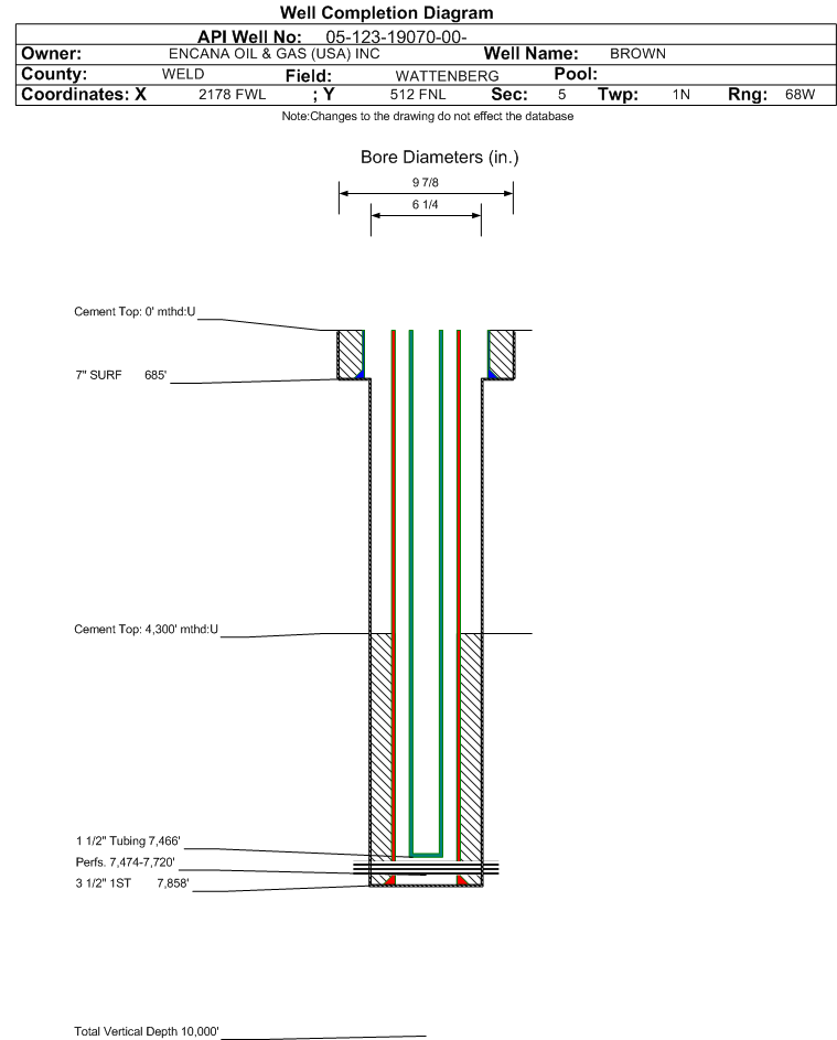 Formation NB-CD Formation Classification: GW Status: AB - 8/26/2025 Interval Top: 7474 ft. Interval Bottom: 7720 ft.| Completed Information for Formation NIOBRARA-CODELL | | 1st Production Date: | 3/14/1996 | Choke Size: | | | Formation Name: | NIOBRARA-CODELL | Commingled: | No | | Production Method: | | | Open Hole Completion: | No |