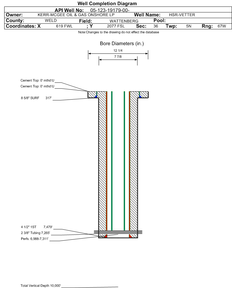 | Wellbore Completed | | Completion Date: | 7/12/1996 | | Measured TD: | 7480 ft. | Measured PB depth: | 7448 ft. | | True Vertical TD: | 0 ft. | True Vertical PB depth: | | | Casing: | String Type: SURF, Hole Size: 12.25 in., Size: 8.625 in., Top: 0 ft., Depth: 317 ft., Weight: 23 , Citings Type: ACTUAL | | Cement: | Sacks: 225, Top: 0 ft., Bottom: 317 ft., Determination Method: VISU | | Casing: | String Type: 1ST, Hole Size: 7.875 in., Size: 4.5 in., Top: 0 ft., Depth: 7479 ft., Weight: 11.6 , Citings Type: ACTUAL | | Cement: | Sacks: 175, Top: 6494 ft., Bottom: 7479 ft., Determination Method: CBL | | Formation | Interval Top | Log Bottom | Cored | DSTs | | SUSSEX | 4274 ft. | | | | | SHANNON | 4749 ft. | | | | | NIOBRARA | 6977 ft. | | | | | FORT HAYS | 7280 ft. | | | | | CODELL | 7302 ft. | | | | | GREENHORN | 7356 ft. | | | |