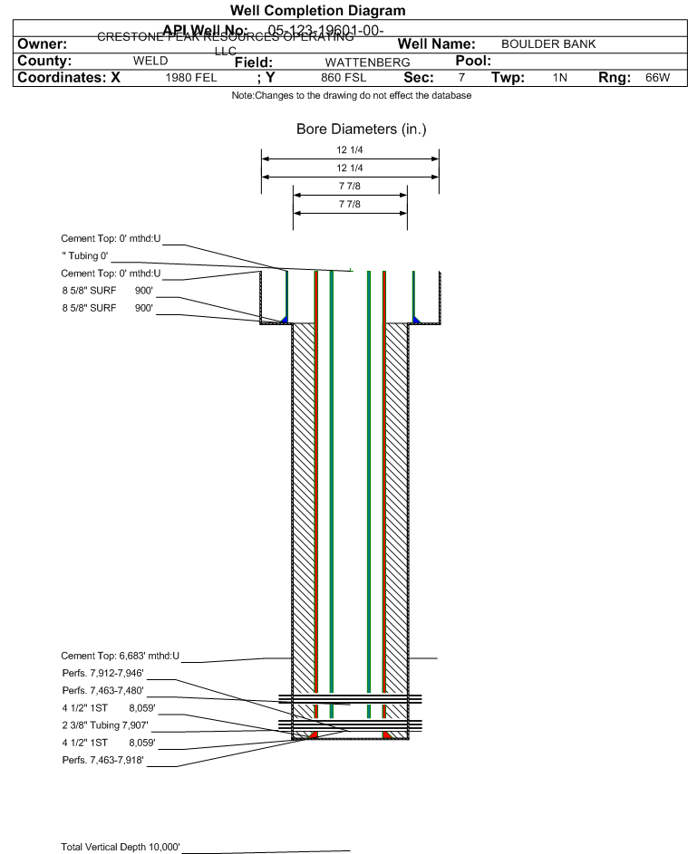 | Wellbore Completed | | Completion Date: | 3/21/1999 | | Spud Date: | 2/25/1999 | Spud Date Is: | ACTUAL | | Measured TD: | 8060 ft. | Measured PB depth: | 8030 ft. | | True Vertical TD: | 0 ft. | True Vertical PB depth: | | | Casing: | String Type: SURF, Hole Size: 12.25 in., Size: 8.625 in., Top: , Depth: 900 ft., Weight: 24 , Citings Type: ACTUAL | | Cement: | Sacks: 525, Top: 0 ft., Bottom: 900 ft., Determination Method: VISU | | Casing: | String Type: SURF, Hole Size: 12.25 in., Size: 8.625 in., Top: 0 ft., Depth: 900 ft., Weight: , Citings Type: HISTORICAL | | Cement: | Sacks: 525, Top: 0 ft., Bottom: , Determination Method: | | Casing: | String Type: 1ST, Hole Size: 7.875 in., Size: 4.5 in., Top: , Depth: 8059 ft., Weight: 11.6 , Citings Type: ACTUAL | | Cement: | Sacks: 250, Top: 6683 ft., Bottom: 8059 ft., Determination Method: CBL | | Casing: | String Type: 1ST, Hole Size: 7.875 in., Size: 4.5 in., Top: 0 ft., Depth: 8059 ft., Weight: , Citings Type: HISTORICAL | | Cement: | Sacks: 0, Top: 0 ft., Bottom: , Determination Method: | | Casing: | String Type: STAGE TOOL, Hole Size: , Size: , Top: , Depth: 4887 ft., Weight: , Citings Type: ACTUAL | | Cement: | Sacks: 200, Top: 4337 ft., Bottom: 4887 ft., Determination Method: CBL | | Formation | Interval Top | Log Bottom | Cored | DSTs | | SUSSEX | 4495 ft. | | | | | NIOBRARA | 7123 ft. | | | | | FORT HAYS | 7438 ft. | | | | | CODELL | 7462 ft. | | | | | CARLILE | 7482 ft. | | | | | GREENHORN | 7520 ft. | | | | | BENTONITE | 7740 ft. | | | | | GRANEROS | 7741 ft. | | | | | MOWRY | 7887 ft. | | | | | J SAND | 7903 ft. | | | | | SKULL CREEK | 8008 ft. | | | |