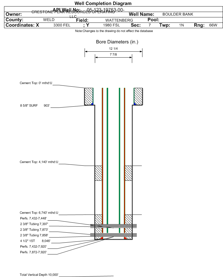 | | Perforation Data: | | Interval Top: | 7432 ft. | # Of Holes: | 106 | | Interval Bottom: | 7920 ft. | Hole Size: | 0.38 in. |