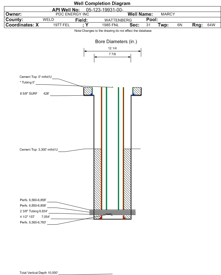 | | Perforation Data: | | Interval Top: | 6560 ft. | # Of Holes: | 28 | | Interval Bottom: | 6760 ft. | Hole Size: | 0.35 in. |