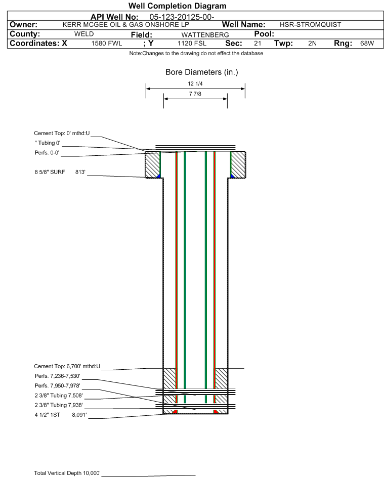 | Wellbore Completed | | Completion Date: | 3/27/2001 | | Spud Date: | 3/6/2001 | Spud Date Is: | ACTUAL | | Measured TD: | 8112 ft. | Measured PB depth: | 8059 ft. | | True Vertical TD: | | True Vertical PB depth: | | | Log Types: | | | Casing: | String Type: SURF, Hole Size: 12.25 in., Size: 8.625 in., Top: 0 ft., Depth: 813 ft., Weight: 24 , Citings Type: ACTUAL | | Cement: | Sacks: 570, Top: 0 ft., Bottom: 813 ft., Determination Method: VISU | | Casing: | String Type: 1ST, Hole Size: 7.875 in., Size: 4.5 in., Top: 0 ft., Depth: 8091 ft., Weight: 11.6 , Citings Type: ACTUAL | | Cement: | Sacks: 270, Top: 6700 ft., Bottom: 8091 ft., Determination Method: CBL | | Casing: | String Type: STAGE TOOL, Hole Size: , Size: , Top: , Depth: 5258 ft., Weight: , Citings Type: ACTUAL | | Cement: | Sacks: 320, Top: 3970 ft., Bottom: 5265 ft., Determination Method: CBL | | Formation | Interval Top | Log Bottom | Cored | DSTs | | SUSSEX | 4349 ft. | | N | N | | SHANNON | 4825 ft. | | N | N | | NIOBRARA | 7232 ft. | | N | N | | FORT HAYS | 7497 ft. | | N | N | | CODELL | 7517 ft. | | N | N | | J SAND | 7947 ft. | | N | N |
