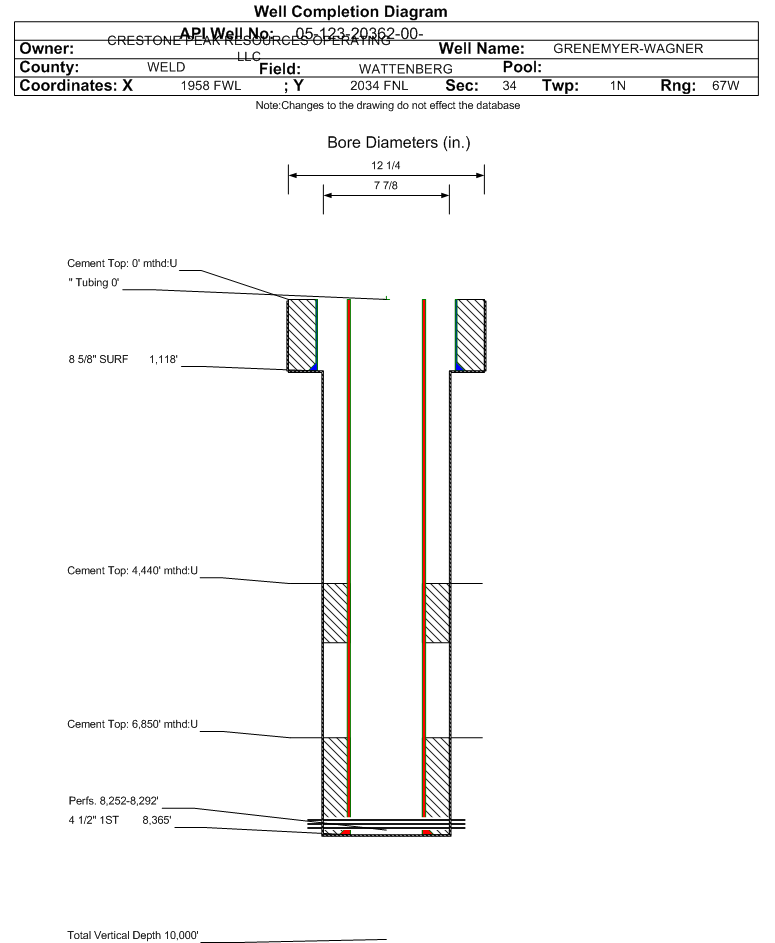 | Wellbore Completed | | Completion Date: | 6/12/2001 | | Spud Date: | 5/16/2001 | Spud Date Is: | ACTUAL | | Measured TD: | 8370 ft. | Measured PB depth: | 8350 ft. | | True Vertical TD: | | True Vertical PB depth: | | | Log Types: | DUAL IND, COMP DENS, COMP NEUTRON | | Casing: | String Type: SURF, Hole Size: 12.25 in., Size: 8.625 in., Top: 0 ft., Depth: 1118 ft., Weight: 24 , Citings Type: ACTUAL | | Cement: | Sacks: 785, Top: 0 ft., Bottom: 1118 ft., Determination Method: VISU | | Casing: | String Type: 1ST, Hole Size: 7.875 in., Size: 4.5 in., Top: 0 ft., Depth: 8365 ft., Weight: 11.6 , Citings Type: ACTUAL | | Cement: | Sacks: 250, Top: 6850 ft., Bottom: 8365 ft., Determination Method: CBL | | Casing: | String Type: S.C. 1.1, Hole Size: , Size: , Top: , Depth: 5364 ft., Weight: , Citings Type: ACTUAL | | Cement: | Sacks: 180, Top: 4440 ft., Bottom: 5364 ft., Determination Method: CBL | | Formation | Interval Top | Log Bottom | Cored | DSTs | | SUSSEX | 4860 ft. | | N | N | | SHANNON | 5400 ft. | | N | N | | NIOBRARA | 7386 ft. | | N | N | | FORT HAYS | 7784 ft. | | N | N | | CODELL | 7807 ft. | | N | N | | CARLILE | 7821 ft. | | N | N | | GREENHORN | 7851 ft. | | N | N | | GRANEROS | 8076 ft. | | N | N | | BENTONITE | 8076 ft. | | N | N | | MOWRY | 8228 ft. | | N | N | | J-2 SAND | 8249 ft. | | N | N | | SKULL CREEK | 8343 ft. | | N | N |