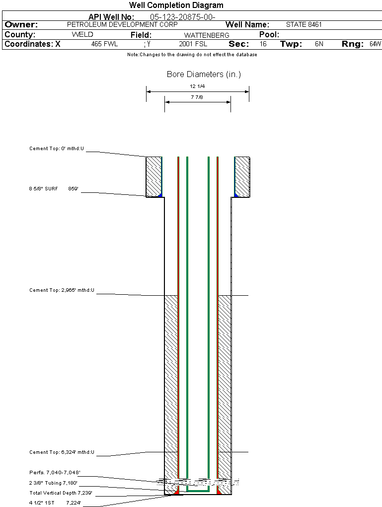 | Wellbore Completed | | Completion Date: | 1/20/2004 | | Spud Date: | 1/3/2004 | Spud Date Is: | ACTUAL | | Measured TD: | 7239 ft. | Measured PB depth: | 7224 ft. | | True Vertical TD: | 7239 ft. | True Vertical PB depth: | 7224 ft. | | Top PZ Location: | Sec: Twp: | Footage: FL FL | | Bottom Hole Location: | Sec: Twp: | Footage: FL FL | | Log Types: | GR, IND, DENSITY, NEUTRON, CBL | | Casing: | String Type: SURF, Hole Size: 12.25 in., Size: 8.625 in., Top: 0 ft., Depth: 859 ft., Weight: 24 , Citings Type: ACTUAL | | Cement: | Sacks: 605, Top: 0 ft., Bottom: 859 ft., Determination Method: CALC | | Casing: | String Type: 1ST, Hole Size: 7.875 in., Size: 4.5 in., Top: 0 ft., Depth: 7224 ft., Weight: 10.5 , Citings Type: ACTUAL | | Cement: | Sacks: 150, Top: 6324 ft., Bottom: 7224 ft., Determination Method: CBL | | Casing: | String Type: S.C. 1.1, Hole Size: , Size: , Top: , Depth: 7224 ft., Weight: , Citings Type: ACTUAL | | Cement: | Sacks: 250, Top: 2965 ft., Bottom: 6324 ft., Determination Method: CBL | | Formation | Interval Top | Log Bottom | Cored | DSTs | | GREELEY SAND | 2845 ft. | | N | N | | PARKMAN | 3742 ft. | | N | N | | SUSSEX | 4235 ft. | | N | N | | SHANNON | 4500 ft. | | N | N | | NIOBRARA | 6785 ft. | | N | N | | FORT HAYS | 7000 ft. | | N | N | | CODELL | 7035 ft. | | N | N | | CARLILE | 7068 ft. | | N | N | | GREENHORN | 7102 ft. | | N | N |