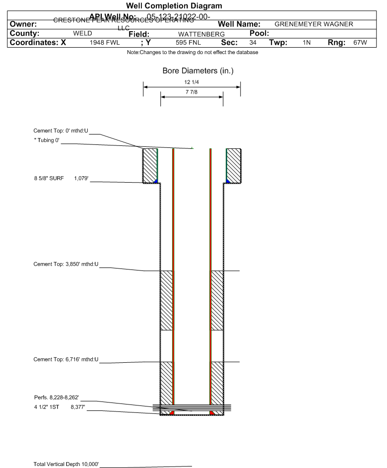 | Wellbore Completed | | Completion Date: | 8/30/2002 | | Spud Date: | 7/31/2002 | Spud Date Is: | ACTUAL | | Measured TD: | 8377 ft. | Measured PB depth: | 8340 ft. | | True Vertical TD: | | True Vertical PB depth: | | | Log Types: | CBL, DUAL IND.,CN / CN | | Casing: | String Type: SURF, Hole Size: 12.25 in., Size: 8.625 in., Top: 0 ft., Depth: 1079 ft., Weight: 24 , Citings Type: ACTUAL | | Cement: | Sacks: 385, Top: 0 ft., Bottom: 1079 ft., Determination Method: VISU | | Casing: | String Type: 1ST, Hole Size: 7.875 in., Size: 4.5 in., Top: 0 ft., Depth: 8377 ft., Weight: 11.6 , Citings Type: ACTUAL | | Cement: | Sacks: 310, Top: 6716 ft., Bottom: 8377 ft., Determination Method: CBL | | Casing: | String Type: S.C. 1.1, Hole Size: , Size: , Top: , Depth: 5715 ft., Weight: , Citings Type: ACTUAL | | Cement: | Sacks: 445, Top: 3850 ft., Bottom: 5715 ft., Determination Method: CBL | | Formation | Interval Top | Log Bottom | Cored | DSTs | | SUSSEX | 4730 ft. | | N | N | | SHANNON | 5374 ft. | | N | N | | NIOBRARA | 7358 ft. | | N | N | | FORT HAYS | 7760 ft. | | N | N | | CODELL | 7783 ft. | | N | N | | CARLILE | 7807 ft. | | N | N | | GREENHORN | 7864 ft. | | N | N | | GRANEROS | 8050 ft. | | N | N | | BENTONITE | 8050 ft. | | N | N | | MOWRY | 8204 ft. | | N | N | | J-2 SAND | 8226 ft. | | N | N | | SKULL CREEK | 8316 ft. | | N | N |