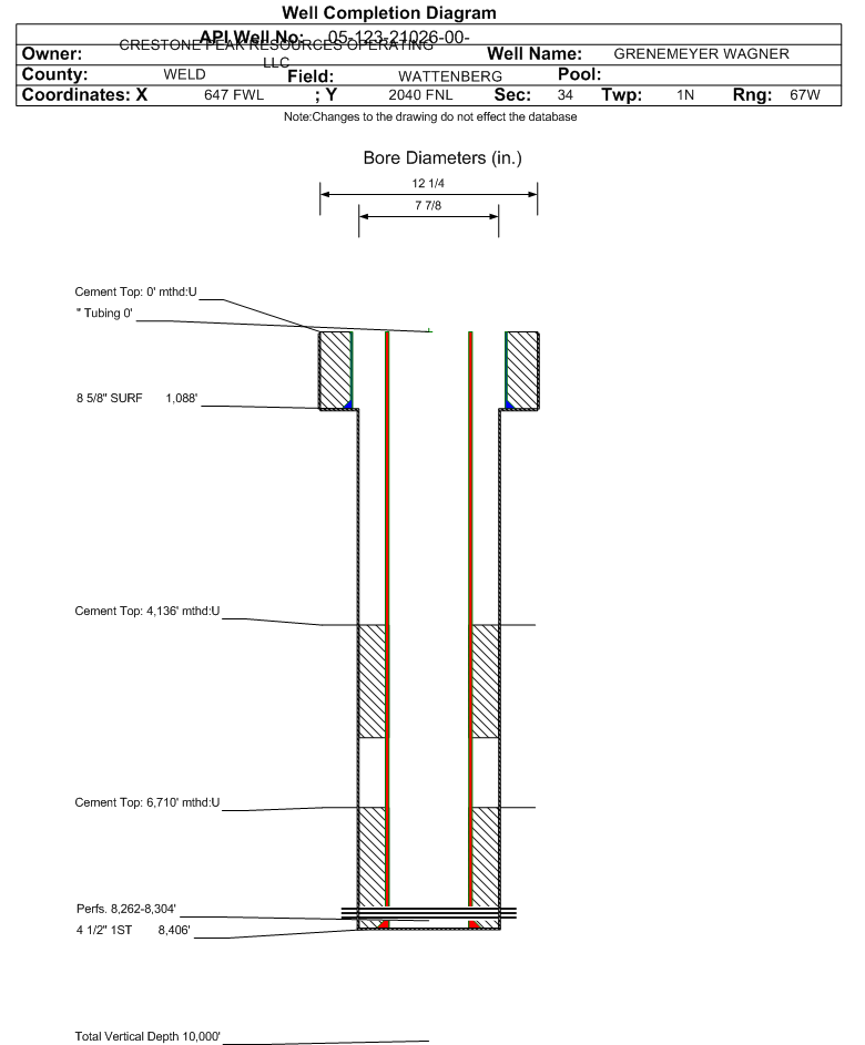| Wellbore Completed | | Completion Date: | 8/23/2002 | | Spud Date: | 7/25/2002 | Spud Date Is: | ACTUAL | | Measured TD: | 8406 ft. | Measured PB depth: | 8390 ft. | | True Vertical TD: | | True Vertical PB depth: | | | Log Types: | | | Casing: | String Type: SURF, Hole Size: 12.25 in., Size: 8.625 in., Top: 0 ft., Depth: 1088 ft., Weight: 24 , Citings Type: ACTUAL | | Cement: | Sacks: 400, Top: 0 ft., Bottom: 1088 ft., Determination Method: VISU | | Casing: | String Type: 1ST, Hole Size: 7.875 in., Size: 4.5 in., Top: 0 ft., Depth: 8406 ft., Weight: 11.6 , Citings Type: ACTUAL | | Cement: | Sacks: 310, Top: 6710 ft., Bottom: 8406 ft., Determination Method: CBL | | Casing: | String Type: S.C. 1.1, Hole Size: , Size: , Top: , Depth: 5725 ft., Weight: , Citings Type: ACTUAL | | Cement: | Sacks: 435, Top: 4136 ft., Bottom: 5725 ft., Determination Method: CBL | | Formation | Interval Top | Log Bottom | Cored | DSTs | | SUSSEX | 4764 ft. | | N | N | | NIOBRARA | 7390 ft. | | N | N | | FORT HAYS | 7793 ft. | | N | N | | CODELL | 7816 ft. | | N | N | | CARLILE | 7840 ft. | | N | N | | GREENHORN | 7860 ft. | | N | N | | GRANEROS | 8088 ft. | | N | N | | BENTONITE | 8088 ft. | | N | N | | MOWRY | 8238 ft. | | N | N | | J-2 SAND | 8260 ft. | | N | N | | SKULL CREEK | 8352 ft. | | N | N |