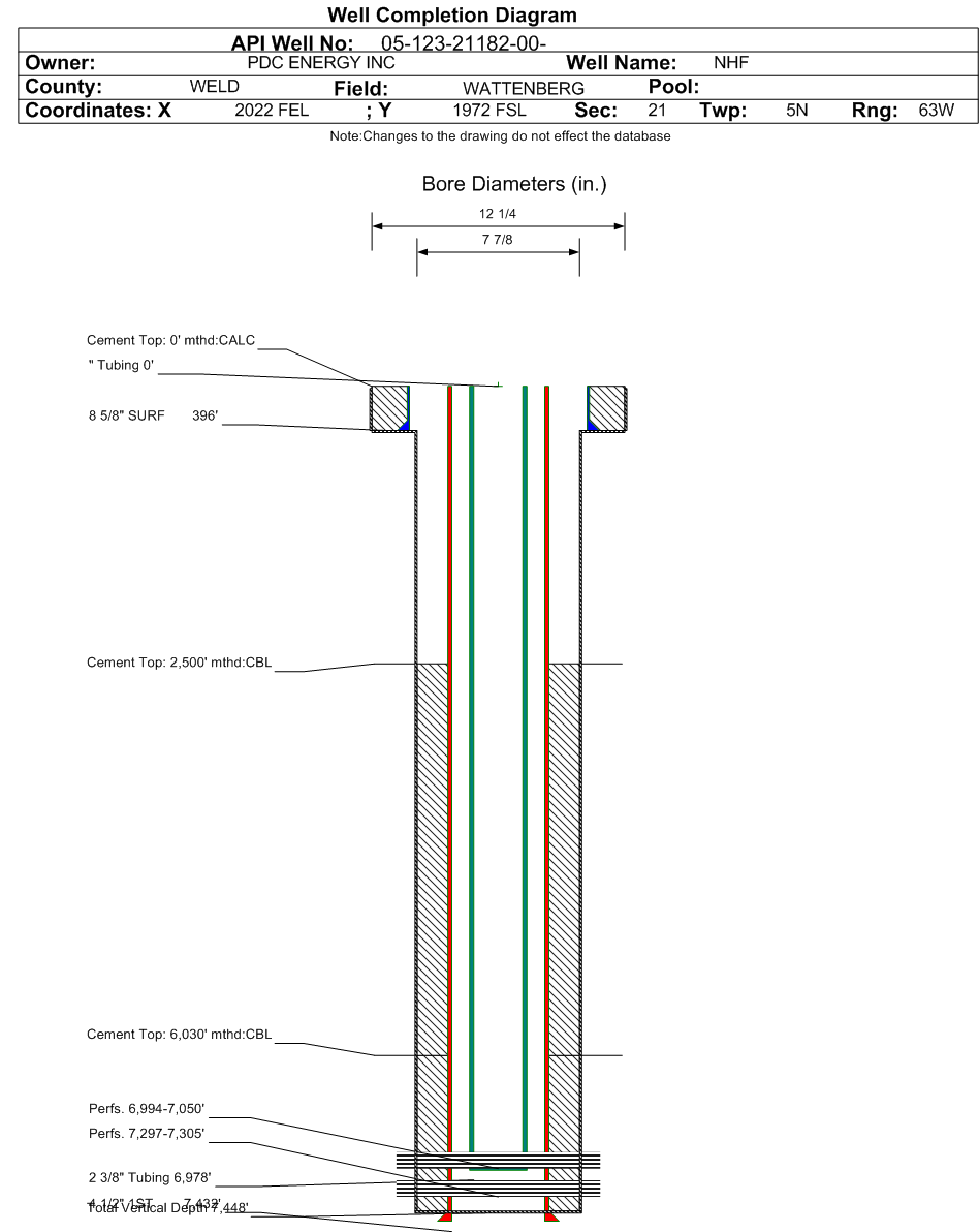 Wellbore #00 Wellbore Classification: GW Status: AB - 6/16/2025 Measured TD: 7448 ft. Vertical TD: 7448 ft.| Wellbore Data for Original Wellbore | Wellbore Classification: GW AB - 6/16/2025 | | Wellbore Permit | DRIFTED | | Permit #: | | Expiration Date: | 1/5/2014 | | Proposed Depth/Form: | 7700 ft. | | Surface Mineral Owner Same: | No | | Mineral Owner: | FEE | Surface Owner: | FEE | | Unit: | | Unit Number: | | | Formation And Spacing: | Code: CODL , Formation: CODELL , Order: , Unit Acreage: 320, Drill Unit: E/2 | | Formation And Spacing: | Code: DKJNC , Formation: DAKOTA-J-NIOBRARA-CODELL , Order: 318A , Unit Acreage: 320, Drill Unit: E/2 | | Formation And Spacing: | Code: GRNHN , Formation: GREENHORN , Order: , Unit Acreage: 320, Drill Unit: E/2 | | Formation And Spacing: | Code: GRRS , Formation: GRANEROS , Order: , Unit Acreage: 320, Drill Unit: E/2 | | Formation And Spacing: | Code: NBRR , Formation: NIOBRARA , Order: , Unit Acreage: 320, Drill Unit: E/2 | | Casing: | String Type: SURF, Hole Size: 12.25 in., Size: 8.625 in., Top: 0 ft., Depth: 396 ft., Weight: 24 , Citings Type: PLANNED | | Cement: | Sacks: 205, Top: 0 ft., Bottom: 396 ft. | | Casing: | String Type: 1ST, Hole Size: 7.875 in., Size: 4.5 in., Top: 0 ft., Depth: 7432 ft., Weight: 10.5 , Citings Type: PLANNED | | Cement: | Sacks: 630, Top: 2500 ft., Bottom: 7432 ft. |