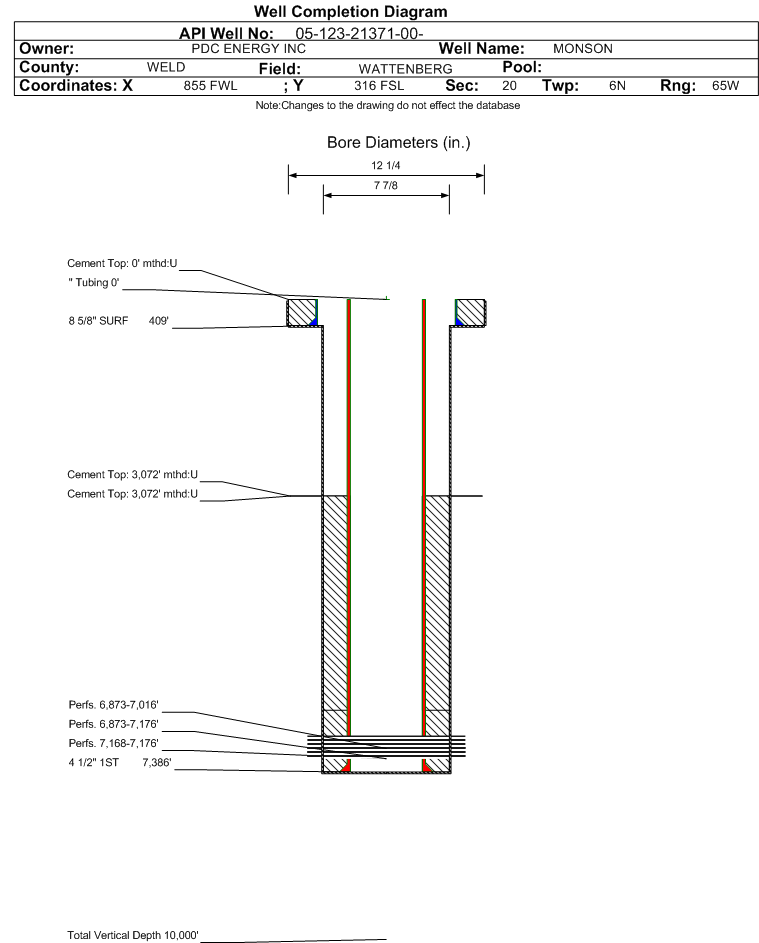 | | Perforation Data: | | Interval Top: | 7168 ft. | # Of Holes: | 24 | | Interval Bottom: | 7176 ft. | Hole Size: | 0.40625 in. |