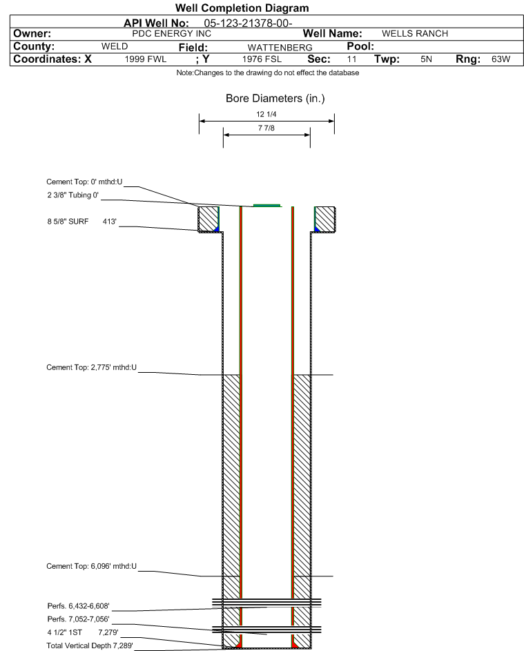 Wellbore #00 Wellbore Classification: OW Status: PA - 12/12/2017 Measured TD: 7289 ft. Vertical TD: 7289 ft.| Wellbore Data for Original Wellbore | Wellbore Classification: OW PA - 12/12/2017 | | Wellbore Permit | | | Permit #: | | Expiration Date: | 12/11/2004 | | Proposed Depth/Form: | 7500 ft. | | Surface Mineral Owner Same: | No | | Mineral Owner: | FEE | Surface Owner: | FEE | | Unit: | | Unit Number: | | | Formation And Spacing: | Code: JSND , Formation: J SAND , Order: 318 , Unit Acreage: 320, Drill Unit: S/2 | | Formation And Spacing: | Code: NB-CD , Formation: NIOBRARA-CODELL , Order: 318 , Unit Acreage: 80, Drill Unit: W2SW4 | | Casing: | String Type: SURF, Hole Size: 12.25 in., Size: 8.625 in., Top: , Depth: 413 ft., Weight: 24 , Citings Type: PLANNED | | Cement: | Sacks: 290, Top: 0 ft., Bottom: 413 ft. | | Casing: | String Type: 1ST, Hole Size: 7.875 in., Size: 4.5 in., Top: , Depth: 7289 ft., Weight: 10.5 , Citings Type: PLANNED | | Cement: | Sacks: 200, Top: 6096 ft., Bottom: 7279 ft. |