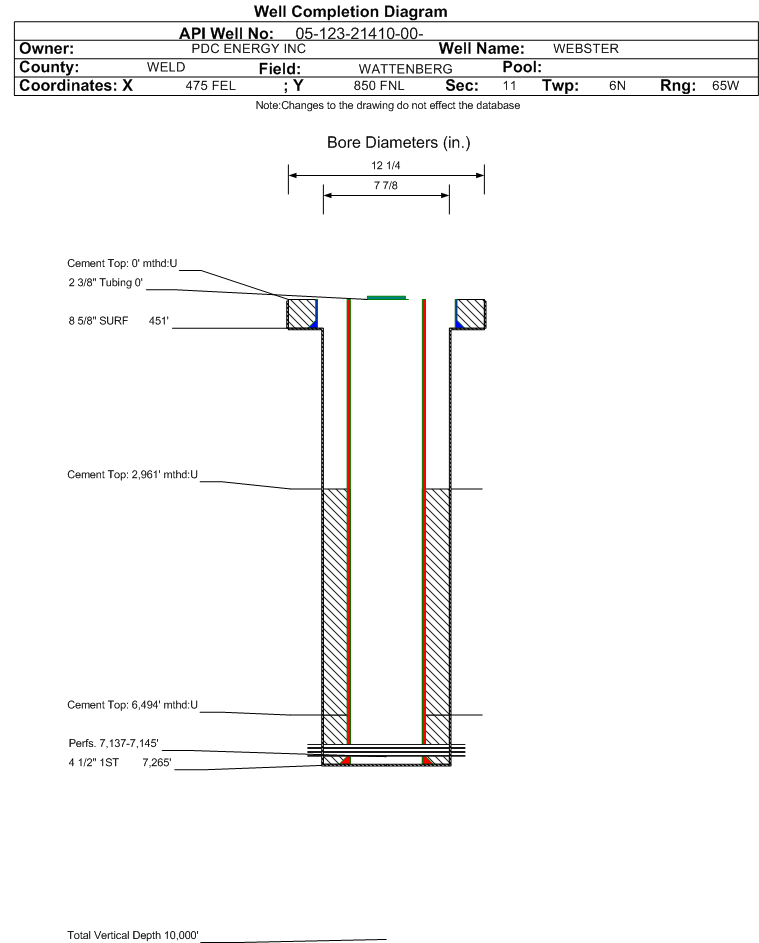 | Wellbore Completed | | Completion Date: | 11/14/2003 | | Spud Date: | 10/31/2003 | Spud Date Is: | ACTUAL | | Measured TD: | 7339 ft. | Measured PB depth: | 7265 ft. | | True Vertical TD: | | True Vertical PB depth: | | | Log Types: | GR, IND, DENSITY,NEUTRON, CBL | | Casing: | String Type: SURF, Hole Size: 12.25 in., Size: 8.625 in., Top: 0 ft., Depth: 451 ft., Weight: 24 , Citings Type: ACTUAL | | Cement: | Sacks: 250, Top: 0 ft., Bottom: 451 ft., Determination Method: VISU | | Casing: | String Type: 1ST, Hole Size: 7.875 in., Size: 4.5 in., Top: 0 ft., Depth: 7265 ft., Weight: 10.5 , Citings Type: ACTUAL | | Cement: | Sacks: 130, Top: 6494 ft., Bottom: 7265 ft., Determination Method: CBL | | Casing: | String Type: S.C. 1.1, Hole Size: , Size: , Top: , Depth: 7265 ft., Weight: , Citings Type: ACTUAL | | Cement: | Sacks: 260, Top: 2961 ft., Bottom: 6494 ft., Determination Method: CBL | | Formation | Interval Top | Log Bottom | Cored | DSTs | | GREELEY SAND | 2840 ft. | | N | N | | PARKMAN | 3660 ft. | | N | N | | SUSSEX | 4250 ft. | | N | N | | SHANNON | 4710 ft. | | N | N | | NIOBRARA | 6880 ft. | | N | N | | FORT HAYS | 7098 ft. | | N | N | | CODELL | 7135 ft. | | N | N | | CARLILE | 7160 ft. | | N | N | | GREENHORN | 7182 ft. | | N | N |