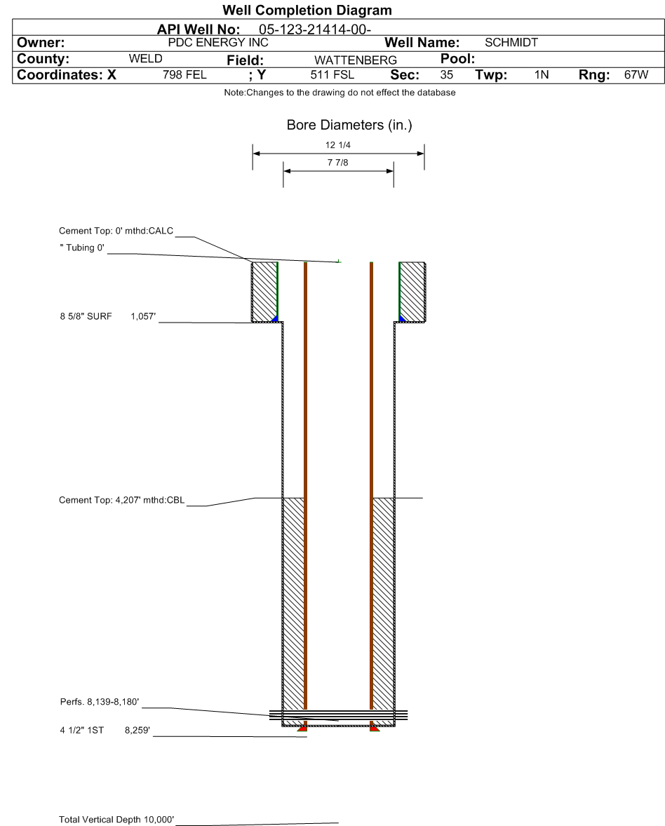 | Wellbore Completed | | Completion Date: | 6/19/2003 | | Spud Date: | 6/2/2003 | Spud Date Is: | ACTUAL | | Measured TD: | 8264 ft. | Measured PB depth: | 8246 ft. | | True Vertical TD: | | True Vertical PB depth: | | | Log Types: | COMPENSATED DEN./NEU/GR; DUAL INDUCTION; CBL | | Casing: | String Type: SURF, Hole Size: 12.25 in., Size: 8.625 in., Top: 0 ft., Depth: 1057 ft., Weight: 24 , Citings Type: ACTUAL | | Cement: | Sacks: 740, Top: 0 ft., Bottom: 1057 ft., Determination Method: VISU | | Casing: | String Type: 1ST, Hole Size: 7.875 in., Size: 4.5 in., Top: 0 ft., Depth: 8259 ft., Weight: 11.6 , Citings Type: ACTUAL | | Cement: | Sacks: 485, Top: 4207 ft., Bottom: 8259 ft., Determination Method: CBL | | Formation | Interval Top | Log Bottom | Cored | DSTs | | SUSSEX | 4710 ft. | | N | N | | NIOBRARA | 7320 ft. | | N | N | | CODELL | 7712 ft. | | N | N | | J SAND | 8138 ft. | | N | N |