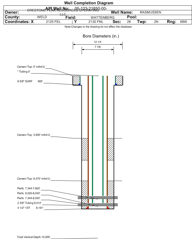 Wellbore #00 Wellbore Classification: GW Status: PA - 2/19/2019 Measured TD: 8211 ft.| Wellbore Data for Original Wellbore | Wellbore Classification: GW PA - 2/19/2019 | | Wellbore Permit | DRIFTED | | Permit #: | 20054178 | Expiration Date: | 12/5/2006 | | Proposed Depth/Form: | 8300 ft. | | Surface Mineral Owner Same: | No | | Mineral Owner: | FEE | Surface Owner: | FEE | | Unit: | | Unit Number: | | | Formation And Spacing: | Code: CODL , Formation: CODELL , Order: 407,407-66, Unit Acreage: 320, Drill Unit: N2 | | Formation And Spacing: | Code: GRNHN , Formation: GREENHORN , Order: , Unit Acreage: 320, Drill Unit: N2 | | Formation And Spacing: | Code: GRRS , Formation: GRANEROS , Order: , Unit Acreage: 320, Drill Unit: N2 | | Formation And Spacing: | Code: NBRR , Formation: NIOBRARA , Order: 407 , Unit Acreage: 320, Drill Unit: N2 | | Casing: | String Type: STAGE TOOL, Hole Size: , Size: , Top: , Depth: 5300 ft., Weight: , Citings Type: PLANNED | | Cement: | Sacks: 200, Top: 4100 ft., Bottom: 5300 ft. |