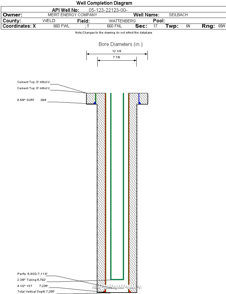 | Wellbore Completed | | Completion Date: | 11/11/2004 | | Spud Date: | 10/7/2004 | Spud Date Is: | ACTUAL | | Measured TD: | 7255 ft. | Measured PB depth: | | | True Vertical TD: | | True Vertical PB depth: | | | Log Types: | GR/CBL/CNL/DIL | | Casing: | String Type: SURF, Hole Size: 12.25 in., Size: 8.625 in., Top: 0 ft., Depth: 394 ft., Weight: 24 , Citings Type: ACTUAL | | Cement: | Sacks: 315, Top: 0 ft., Bottom: 394 ft., Determination Method: VISU | | Casing: | String Type: 1ST, Hole Size: 7.875 in., Size: 4.5 in., Top: 0 ft., Depth: 7238 ft., Weight: 11.6 , Citings Type: ACTUAL | | Cement: | Sacks: 630, Top: 0 ft., Bottom: 7238 ft., Determination Method: CBL | | Formation | Interval Top | Log Bottom | Cored | DSTs | | PARKMAN | 3720 ft. | | N | N | | SUSSEX | 4450 ft. | | N | N | | NIOBRARA | 6798 ft. | | N | N | | CODELL | 7099 ft. | | N | N |