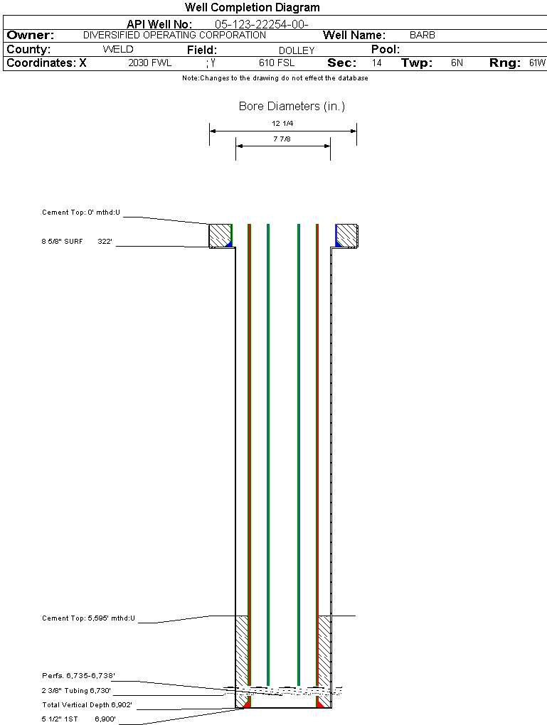 | Wellbore Completed | | Completion Date: | 7/2/2004 | | Spud Date: | 6/25/2004 | Spud Date Is: | ACTUAL | | Measured TD: | 6902 ft. | Measured PB depth: | | | True Vertical TD: | | True Vertical PB depth: | | | Log Types: | CDNL/DIL | | Casing: | String Type: SURF, Hole Size: 12.25 in., Size: 8.625 in., Top: 0 ft., Depth: 322 ft., Weight: 24 , Citings Type: ACTUAL | | Cement: | Sacks: 235, Top: 0 ft., Bottom: 322 ft., Determination Method: VISU | | Casing: | String Type: 1ST, Hole Size: 7.875 in., Size: 5.5 in., Top: 0 ft., Depth: 6902 ft., Weight: 15.5 , Citings Type: ACTUAL | | Cement: | Sacks: 200, Top: 5595 ft., Bottom: 6902 ft., Determination Method: CBL | | Formation | Interval Top | Log Bottom | Cored | DSTs | | NIOBRARA | 6040 ft. | 6260 ft. | N | N | | CODELL | 6290 ft. | 6340 ft. | N | N | | D SAND | 6730 ft. | 6757 ft. | N | N | | J SAND | 6800 ft. | | N | N |