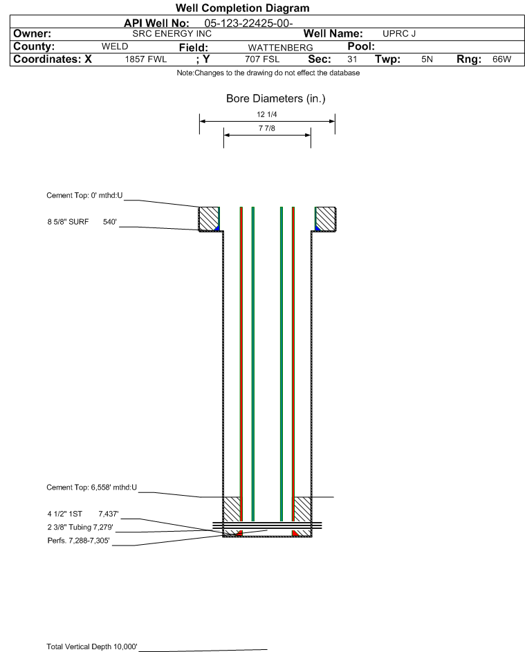 | Wellbore Completed | | Completion Date: | 11/24/2004 | | Spud Date: | 11/8/2004 | Spud Date Is: | ACTUAL | | Measured TD: | 7462 ft. | Measured PB depth: | 7420 ft. | | True Vertical TD: | | True Vertical PB depth: | | | Log Types: | DIL, CNL/CDL, CBL | | Casing: | String Type: SURF, Hole Size: 12.25 in., Size: 8.625 in., Top: 0 ft., Depth: 540 ft., Weight: 23 , Citings Type: ACTUAL | | Cement: | Sacks: 380, Top: 0 ft., Bottom: 540 ft., Determination Method: VISU | | Casing: | String Type: 1ST, Hole Size: 7.875 in., Size: 4.5 in., Top: 0 ft., Depth: 7437 ft., Weight: 11.6 , Citings Type: ACTUAL | | Cement: | Sacks: 140, Top: 6558 ft., Bottom: 7437 ft., Determination Method: CBL | | Formation | Interval Top | Log Bottom | Cored | DSTs | | SUSSEX | 4780 ft. | | N | N | | NIOBRARA | 6976 ft. | | N | N | | FORT HAYS | 7266 ft. | | N | N | | CODELL | 7288 ft. | | N | N |
