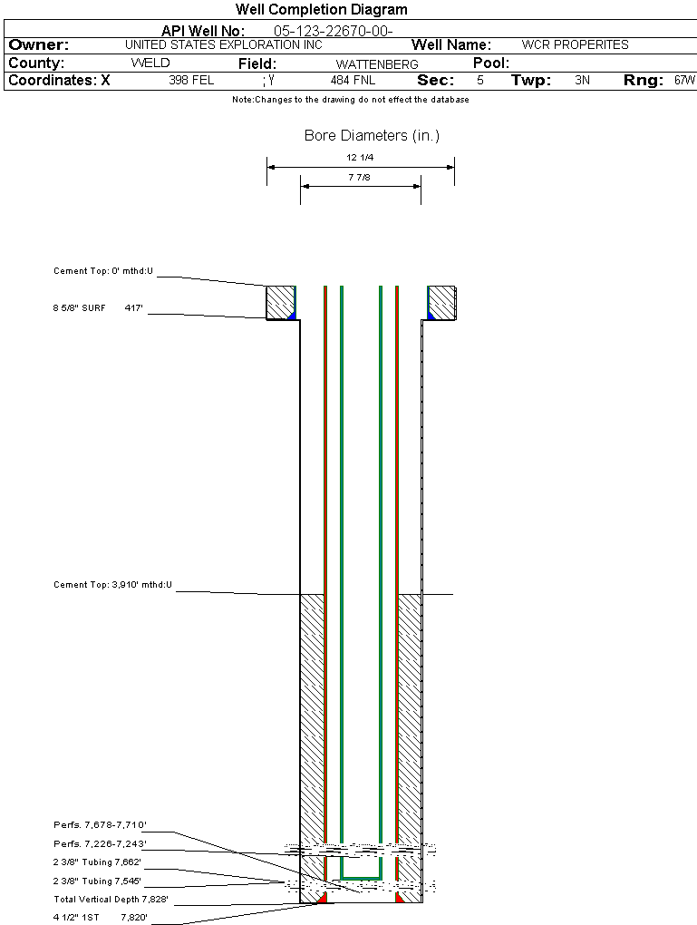 Formation CODL Formation Classification: GW Status: AB - 4/24/2023 Interval Top: 7226 ft. Interval Bottom: 7243 ft.| Completed Information for Formation CODELL | | 1st Production Date: | 11/1/2005 | Choke Size: | | | Formation Name: | CODELL | Commingled: | Yes | | Production Method: | | | Open Hole Completion: | No |