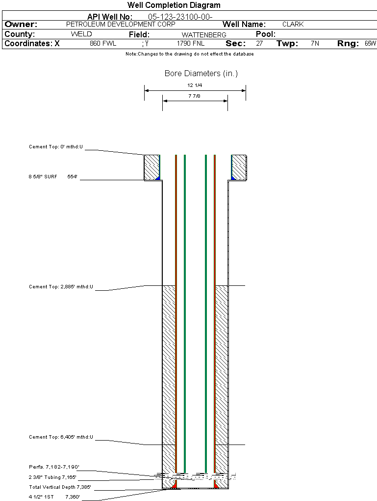 | Wellbore Completed | | Completion Date: | 8/8/2005 | | Spud Date: | 7/28/2005 | Spud Date Is: | ACTUAL | | Measured TD: | 7385 ft. | Measured PB depth: | 7360 ft. | | True Vertical TD: | | True Vertical PB depth: | | | Log Types: | COMPENSATED DENSITY, COMPENSATED NEUTRON, DUAL INDUCTION, GR, CEMENT BOND LOG, CCL | | Casing: | String Type: SURF, Hole Size: 12.25 in., Size: 8.625 in., Top: 0 ft., Depth: 554 ft., Weight: 24 , Citings Type: ACTUAL | | Cement: | Sacks: 300, Top: 0 ft., Bottom: 554 ft., Determination Method: VISU | | Casing: | String Type: 1ST, Hole Size: 7.875 in., Size: 4.5 in., Top: 0 ft., Depth: 7360 ft., Weight: 10.5 , Citings Type: ACTUAL | | Cement: | Sacks: 130, Top: 6405 ft., Bottom: 7360 ft., Determination Method: CBL | | Casing: | String Type: S.C. 1.1, Hole Size: , Size: , Top: , Depth: 6405 ft., Weight: , Citings Type: ACTUAL | | Cement: | Sacks: 330, Top: 2805 ft., Bottom: 6405 ft., Determination Method: CBL | | Formation | Interval Top | Log Bottom | Cored | DSTs | | GREELEY SAND | 3150 ft. | | N | N | | PARKMAN | 3785 ft. | | N | N | | SUSSEX | 4187 ft. | | N | N | | SHANNON | 4488 ft. | | N | N | | NIOBRARA | 6880 ft. | | N | N | | FORT HAYS | 7127 ft. | | N | N | | CODELL | 7170 ft. | | N | N | | CARLILE | 7205 ft. | | N | N | | GREENHORN | 7250 ft. | | N | N |