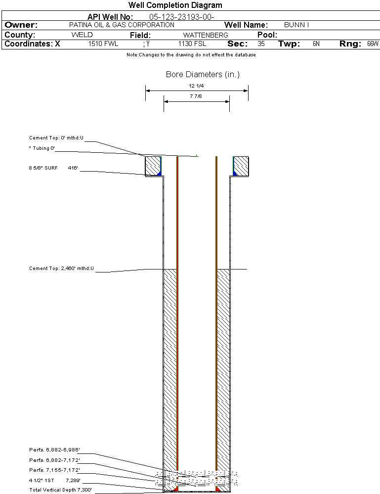 | Wellbore Completed | | Completion Date: | 10/1/2005 | | Spud Date: | 9/29/2005 | Spud Date Is: | ACTUAL | | Measured TD: | 7300 ft. | Measured PB depth: | 7257 ft. | | True Vertical TD: | | True Vertical PB depth: | | | Log Types: | DIL/GR/SP/COMP DENSITY/NEUTRON/MICROLOG/CALIPER. CBL/VDL/GR/CCL | | Casing: | String Type: SURF, Hole Size: 12.25 in., Size: 8.625 in., Top: 0 ft., Depth: 416 ft., Weight: 24 , Citings Type: ACTUAL | | Cement: | Sacks: 355, Top: 0 ft., Bottom: 416 ft., Determination Method: VISU | | Casing: | String Type: 1ST, Hole Size: 7.875 in., Size: 4.5 in., Top: 0 ft., Depth: 7289 ft., Weight: 11.6 , Citings Type: ACTUAL | | Cement: | Sacks: 670, Top: 2460 ft., Bottom: 7289 ft., Determination Method: CBL | | Formation | Interval Top | Log Bottom | Cored | DSTs | | PARKMAN | 3580 ft. | | N | N | | SUSSEX | 4365 ft. | | N | N | | SHANNON | 4790 ft. | | N | N | | NIOBRARA | 6850 ft. | | N | N | | FORT HAYS | 7122 ft. | | N | N | | CODELL | 7147 ft. | | N | N |