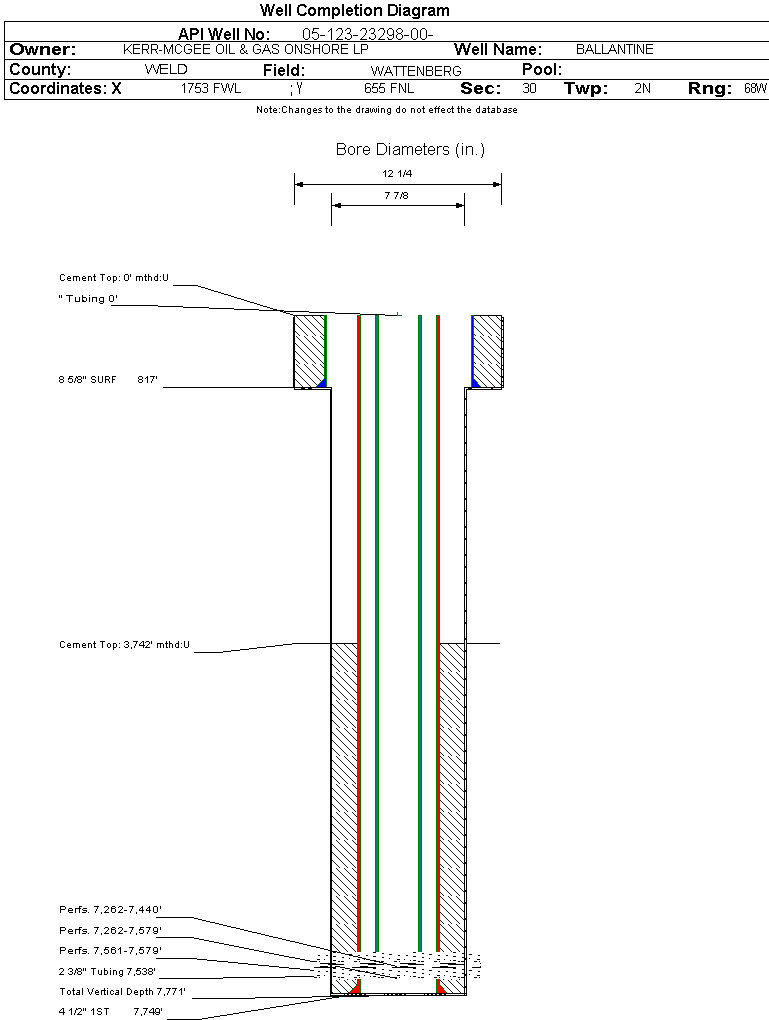 | | Perforation Data: | | Interval Top: | 7262 ft. | # Of Holes: | 84 | | Interval Bottom: | 7440 ft. | Hole Size: | 0.42 in. |
