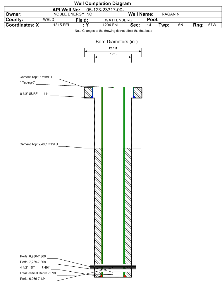| Wellbore Completed | | Completion Date: | 12/5/2005 | | Spud Date: | 12/1/2005 | Spud Date Is: | ACTUAL | | Measured TD: | 7499 ft. | Measured PB depth: | 7467 ft. | | True Vertical TD: | 7390 ft. | True Vertical PB depth: | 7358 ft. | | Top PZ Location: | Sec:15 Twp: 5N 67W | Footage: 504 FNL 776 FEL | | Bottom Hole Location: | Sec:15 Twp: 5N 67W | Footage: 504 FNL 776 FEL | | Log Types: | CDL/CNL/ML, DIL/GR,GR/CCL/CBL | | Casing: | String Type: SURF, Hole Size: 12.25 in., Size: 8.625 in., Top: 0 ft., Depth: 411 ft., Weight: 24 , Citings Type: ACTUAL | | Cement: | Sacks: 290, Top: 0 ft., Bottom: 411 ft., Determination Method: VISU | | Casing: | String Type: 1ST, Hole Size: 7.875 in., Size: 4.5 in., Top: 0 ft., Depth: 7491 ft., Weight: 11.6 , Citings Type: ACTUAL | | Cement: | Sacks: 830, Top: 2410 ft., Bottom: 7491 ft., Determination Method: CBL | | Formation | Interval Top | Log Bottom | Cored | DSTs | | SUSSEX | 4304 ft. | | N | N | | SHANNON | 4774 ft. | | N | N | | NIOBRARA | 6974 ft. | | N | N | | FORT HAYS | 7266 ft. | | N | N | | CODELL | 7288 ft. | | N | N |