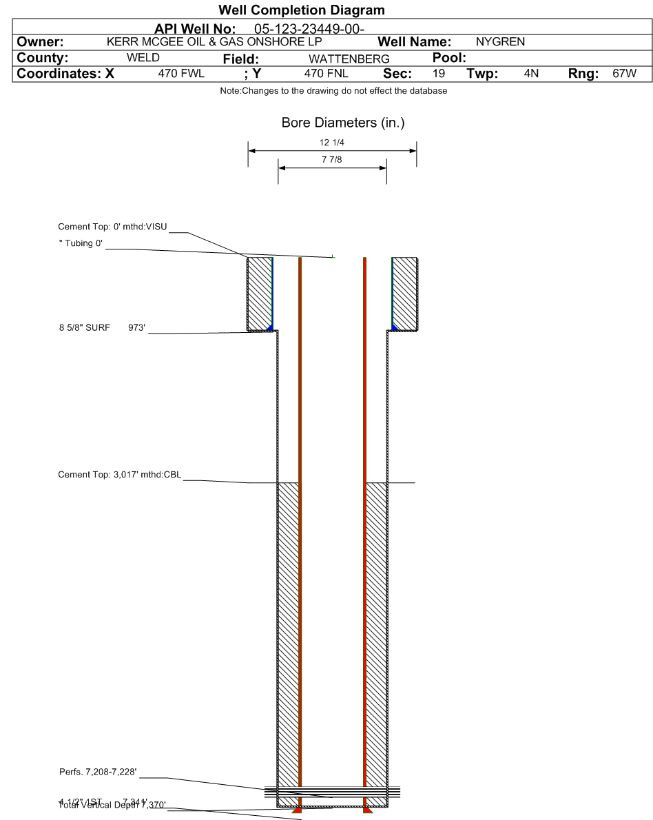 | | Perforation Data: | | Interval Top: | 7208 ft. | # Of Holes: | 60 | | Interval Bottom: | 7228 ft. | Hole Size: | 0.38 in. |