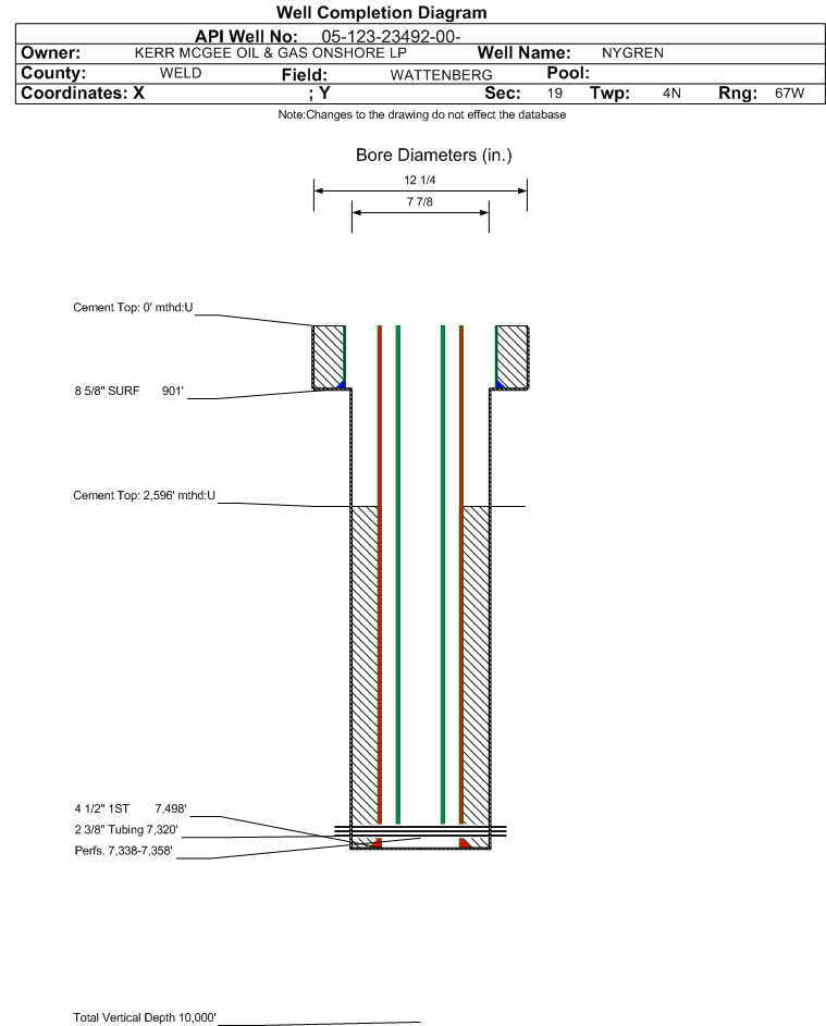 Wellbore #00 Wellbore Classification: GW Status: PA - 2/12/2019 Measured TD: 7500 ft.| Wellbore Data for Original Wellbore | Wellbore Classification: GW PA - 2/12/2019 | | Wellbore Permit | | | Permit #: | 20054670 | Expiration Date: | 1/9/2007 | | Proposed Depth/Form: | 7525 ft. | | Surface Mineral Owner Same: | No | | Mineral Owner: | FEE | Surface Owner: | FEE | | Unit: | | Unit Number: | | | Formation And Spacing: | Code: NB-CD , Formation: NIOBRARA-CODELL , Order: 407-87 , Unit Acreage: 80, Drill Unit: N/2SW |