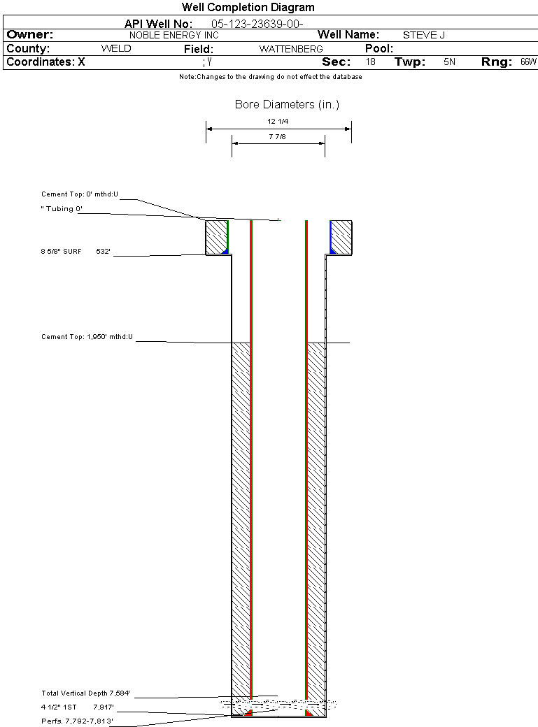 | Wellbore Completed | | Completion Date: | 6/1/2006 | | Spud Date: | 5/27/2006 | Spud Date Is: | ACTUAL | | Measured TD: | 7944 ft. | Measured PB depth: | 7901 ft. | | True Vertical TD: | 7584 ft. | True Vertical PB depth: | 7541 ft. | | Top PZ Location: | Sec:18 Twp: 5N 66 | Footage: 683 FSL 637 FEL | | Bottom Hole Location: | Sec:18 Twp: 5N 66 | Footage: 683 FSL 637 FEL | | Log Types: | GR/CCL/CBL, CDL/CNL/ML, DIL/GR | | Casing: | String Type: SURF, Hole Size: 12.25 in., Size: 8.625 in., Top: 0 ft., Depth: 532 ft., Weight: 24 , Citings Type: ACTUAL | | Cement: | Sacks: 385, Top: 0 ft., Bottom: 532 ft., Determination Method: VISU | | Casing: | String Type: 1ST, Hole Size: 7.875 in., Size: 4.5 in., Top: 0 ft., Depth: 7918 ft., Weight: 11.6 , Citings Type: ACTUAL | | Cement: | Sacks: 1010, Top: 1960 ft., Bottom: 7918 ft., Determination Method: CBL | | Formation | Interval Top | Log Bottom | Cored | DSTs | | PARKMAN | 3793 ft. | | N | N | | SUSSEX | 4970 ft. | | N | N | | SHANNON | 5246 ft. | | N | N | | NIOBRARA | 7462 ft. | | N | N | | FORT HAYS | 7762 ft. | | N | N | | CODELL | 7793 ft. | | N | N |