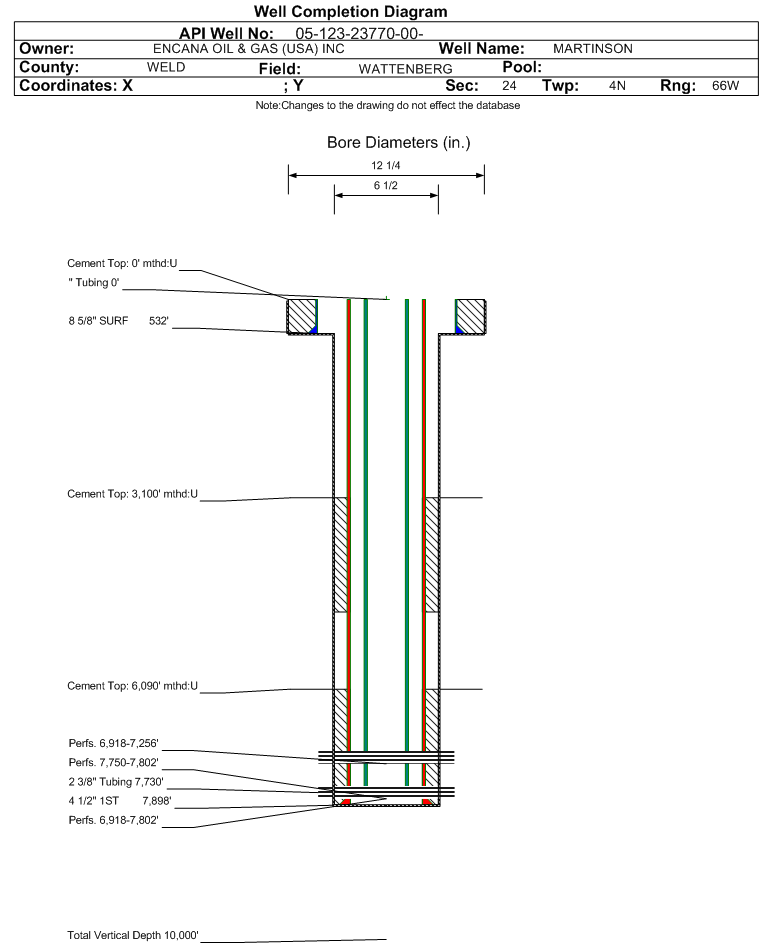 Wellbore #00 Wellbore Classification: GW Status: PR - 6/1/2023 Measured TD: 7911 ft.| Wellbore Data for Original Wellbore | Wellbore Classification: GW PR - 6/1/2023 | | Wellbore Permit | | | Permit #: | 20060887 | Expiration Date: | 4/10/2007 | | Proposed Top PZ Location: | Sec:24 Twp: 4N 66W | Footage: 1915 FSL 989 FWL | | Bottom Hole Location: | Sec:24 Twp: 4N 66W | Footage: 1915 FSL 989 FWL | | Proposed Depth/Form: | 7834 ft. | | Surface Mineral Owner Same: | Yes | | Mineral Owner: | FEE | Surface Owner: | FEE | | Unit: | | Unit Number: | | | Formation And Spacing: | Code: CODL , Formation: CODELL , Order: 407-87 , Unit Acreage: 160, Drill Unit: SW/4 | | Formation And Spacing: | Code: GRNHN , Formation: GREENHORN , Order: , Unit Acreage: 160, Drill Unit: SW/4 | | Formation And Spacing: | Code: JSND , Formation: J SAND , Order: 232-23 , Unit Acreage: 320, Drill Unit: S2 | | Formation And Spacing: | Code: NBRR , Formation: NIOBRARA , Order: 407-87 , Unit Acreage: 160, Drill Unit: SW4 | | Casing: | String Type: STAGE TOOL, Hole Size: , Size: , Top: , Depth: 5000 ft., Weight: , Citings Type: PLANNED | | Cement: | Sacks: 200, Top: 4000 ft., Bottom: 5000 ft. |