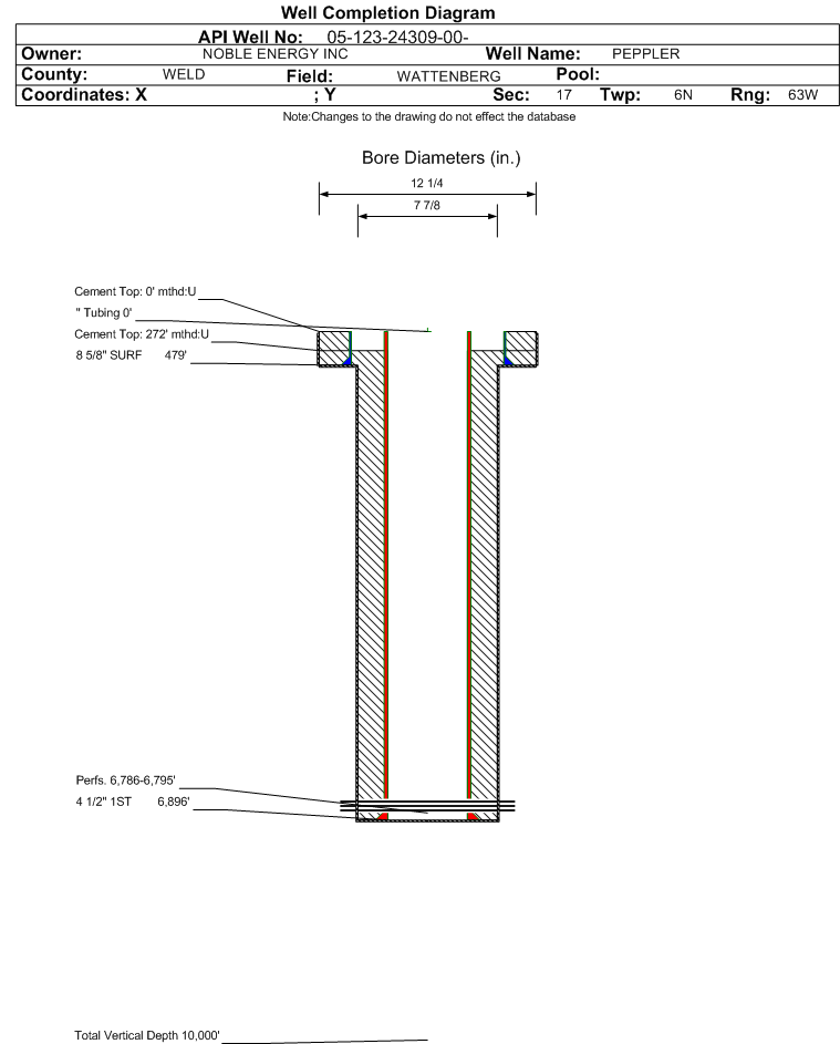 Wellbore #00 Wellbore Classification: OW Status: PA - 1/6/2015 Measured TD: 6936 ft.| Wellbore Data for Original Wellbore | Wellbore Classification: OW PA - 1/6/2015 | | Wellbore Permit | DRIFTED | | Permit #: | 20075793 | Expiration Date: | 11/18/2008 | | Proposed Depth/Form: | 7000 ft. | | Surface Mineral Owner Same: | Yes | | Mineral Owner: | FEE | Surface Owner: | FEE | | Unit: | | Unit Number: | | | Formation And Spacing: | Code: NB-CD , Formation: NIOBRARA-CODELL , Order: , Unit Acreage: 80, Drill Unit: W2SW4 |