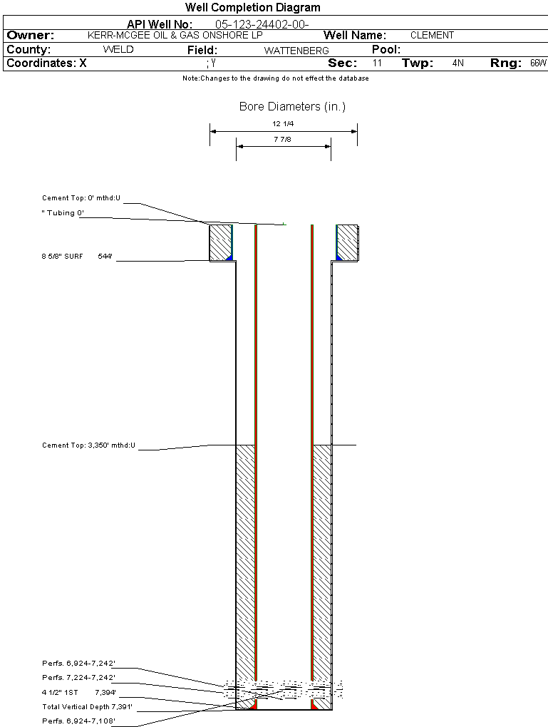 | Wellbore Completed | | Completion Date: | 12/17/2007 | | Spud Date: | 12/11/2007 | Spud Date Is: | ACTUAL | | Measured TD: | 7405 ft. | Measured PB depth: | 7378 ft. | | True Vertical TD: | 7391 ft. | True Vertical PB depth: | 7364 ft. | | Top PZ Location: | Sec:11 Twp: 4N 66W | Footage: 1170 FSL 1319 FEL | | Bottom Hole Location: | Sec:11 Twp: 4N 66W | Footage: 1170 FSL 1319 FEL | | Log Types: | CBL, CDL/CNL/ML, DIL/GL/GR | | Casing: | String Type: SURF, Hole Size: 12.25 in., Size: 8.625 in., Top: 0 ft., Depth: 543 ft., Weight: 24 , Citings Type: ACTUAL | | Cement: | Sacks: 295, Top: 0 ft., Bottom: 543 ft., Determination Method: VISU | | Casing: | String Type: 1ST, Hole Size: 7.875 in., Size: 4.5 in., Top: 0 ft., Depth: 7394 ft., Weight: 11.6 , Citings Type: ACTUAL | | Cement: | Sacks: 553, Top: 3350 ft., Bottom: 7394 ft., Determination Method: CBL | | Formation | Interval Top | Log Bottom | Cored | DSTs | | PARKMAN | 3678 ft. | | N | N | | SUSSEX | 4320 ft. | | N | N | | TEEPEE BUTTES | 6196 ft. | | N | N | | NIOBRARA | 6910 ft. | | N | N | | FORT HAYS | 7202 ft. | | N | N | | CODELL | 7224 ft. | | N | N |
