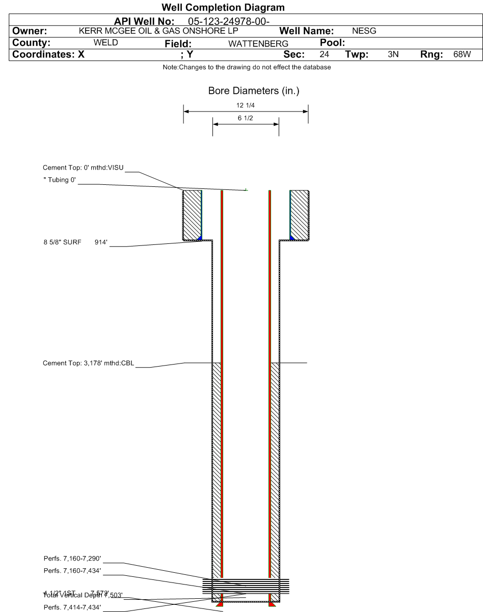 Wellbore #00 Wellbore Classification: GW Status: PA - 8/31/2020 Measured TD: 7585 ft. Vertical TD: 7503 ft.| Wellbore Data for Original Wellbore | Wellbore Classification: GW PA - 8/31/2020 | | Wellbore Permit | DIRECTIONAL | | Permit #: | 20071070 | Expiration Date: | 4/3/2008 | | Proposed Top PZ Location: | Sec:24 Twp: 3N 68W | Footage: 2006 FSL 669 FWL | | Bottom Hole Location: | Sec:24 Twp: 3N 68W | Footage: 2006 FSL 669 FWL | | Proposed Depth/Form: | 7545 ft. | | Surface Mineral Owner Same: | Yes | | Mineral Owner: | FEE | Surface Owner: | FEE | | Unit: | | Unit Number: | | | Formation And Spacing: | Code: NB-CD , Formation: NIOBRARA-CODELL , Order: 407 , Unit Acreage: 80, Drill Unit: W/2SW |