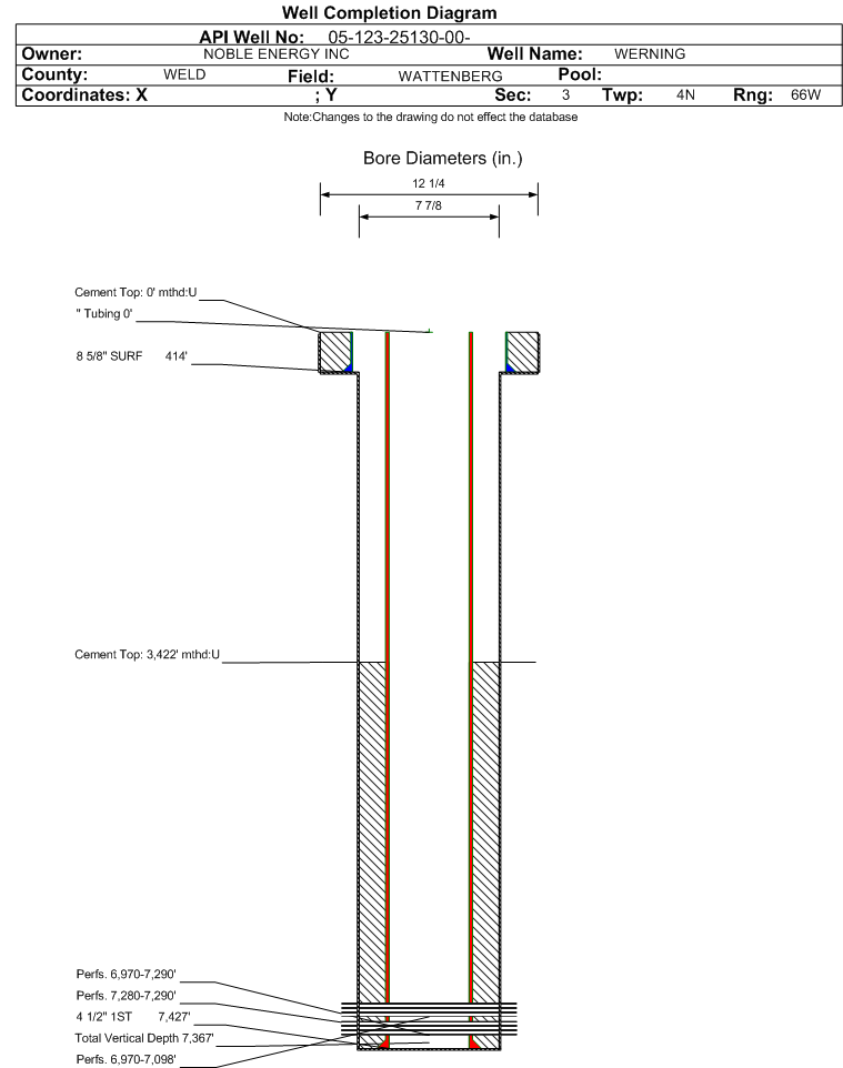 | | Perforation Data: | | Interval Top: | 6970 ft. | # Of Holes: | 112 | | Interval Bottom: | 7290 ft. | Hole Size: | 3.375 in. |
