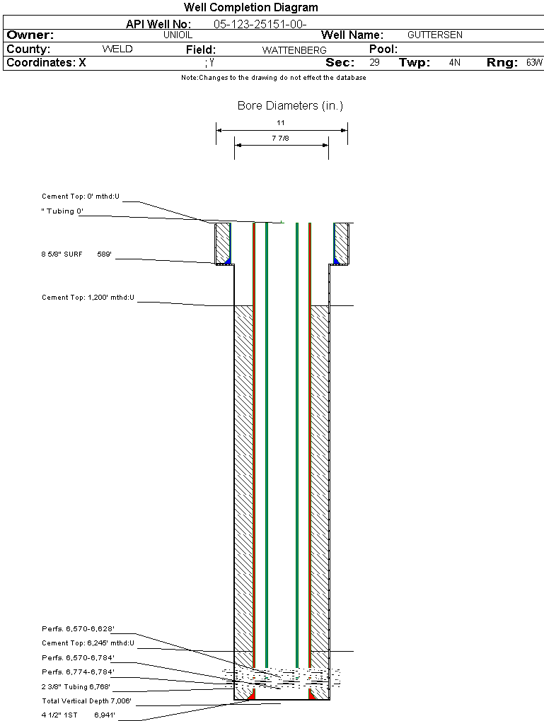 | | Perforation Data: | | Interval Top: | 6570 ft. | # Of Holes: | 46 | | Interval Bottom: | 6628 ft. | Hole Size: | 0.39 in. |
