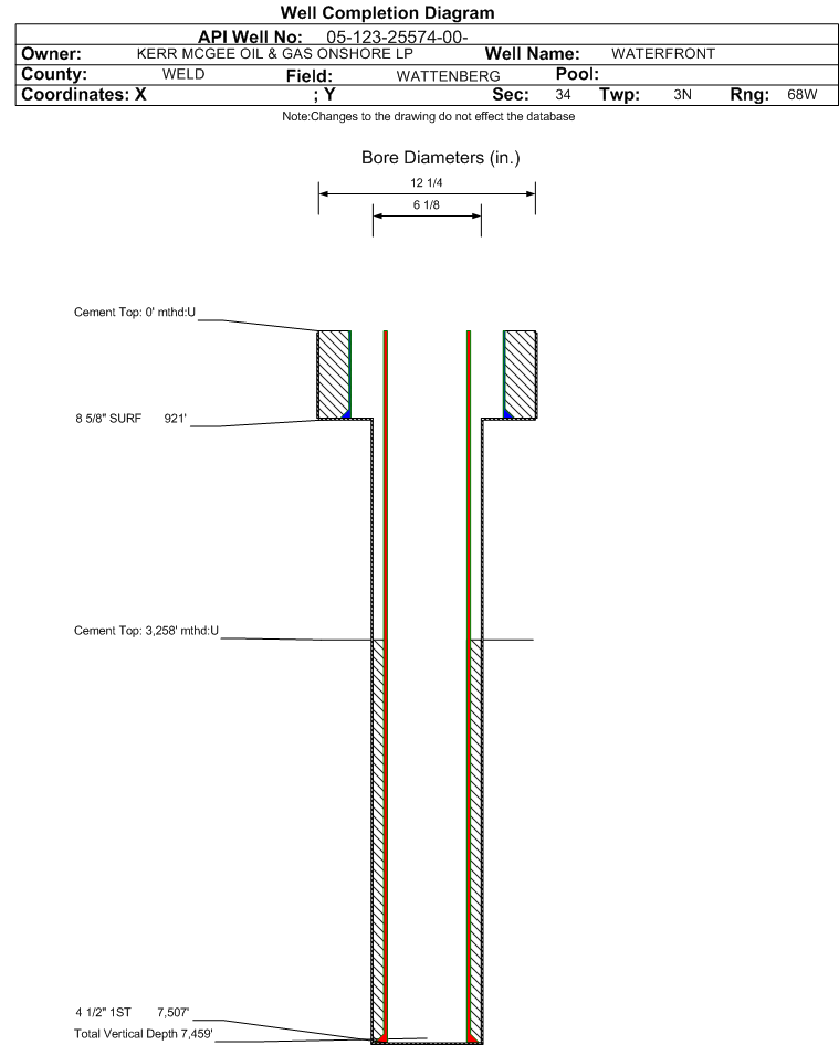 Wellbore #00 Wellbore Classification: OW Status: AB - 6/11/2008 Measured TD: 7505 ft. Vertical TD: 7459 ft.| Wellbore Data for Original Wellbore | Wellbore Classification: OW AB - 6/11/2008 | | Wellbore Permit | DIRECTIONAL | | Permit #: | 20076778 | Expiration Date: | 3/5/2009 | | Proposed Top PZ Location: | Sec: Twp: | Footage: 2050 FNL 2050 FEL | | Bottom Hole Location: | Sec:34 Twp: 3N 68W | Footage: 2050 FNL 2050 FEL | | Proposed Depth/Form: | 7496 ft. | | Surface Mineral Owner Same: | No | | Mineral Owner: | FEE | Surface Owner: | FEE | | Unit: | | Unit Number: | | | Formation And Spacing: | Code: NB-CD , Formation: NIOBRARA-CODELL , Order: 407 , Unit Acreage: 80, Drill Unit: 3N68W | | Casing: | String Type: 1ST, Hole Size: 7.875 in., Size: 4.5 in., Top: , Depth: 7496 ft., Weight: 11.6 , Citings Type: PLANNED | | Cement: | Sacks: 200, Top: , Bottom: 7496 ft. |