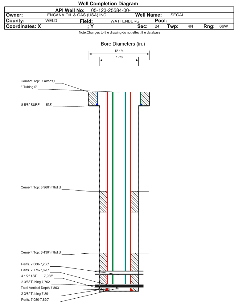 Wellbore #00 Wellbore Classification: GW Status: PR - 6/1/2023 Measured TD: 7955 ft. Vertical TD: 7863 ft.| Wellbore Data for Original Wellbore | Wellbore Classification: GW PR - 6/1/2023 | | Wellbore Permit | DIRECTIONAL | | Permit #: | | Expiration Date: | 10/17/2010 | | Proposed Top PZ Location: | Sec:24 Twp: 4N 66W | Footage: 2590 FNL 1320 FWL | | Bottom Hole Location: | Sec:24 Twp: 4N 66W | Footage: 2563 FNL 1320 FWL | | Proposed Depth/Form: | 7921 ft. | | Surface Mineral Owner Same: | Yes | | Mineral Owner: | FEE | Surface Owner: | FEE | | Unit: | | Unit Number: | | | Formation And Spacing: | Code: CODL , Formation: CODELL , Order: 407-87 , Unit Acreage: 160, Drill Unit: GWA | | Formation And Spacing: | Code: JSND , Formation: J SAND , Order: , Unit Acreage: 160, Drill Unit: GWA | | Formation And Spacing: | Code: NBRR , Formation: NIOBRARA , Order: 407-87 , Unit Acreage: 160, Drill Unit: GWA | | Casing: | String Type: SURF, Hole Size: 12.25 in., Size: 8.625 in., Top: , Depth: 538 ft., Weight: 24 , Citings Type: PLANNED | | Cement: | Sacks: 255, Top: 0 ft., Bottom: 538 ft. | | Casing: | String Type: 1ST, Hole Size: 7.875 in., Size: 4.5 in., Top: , Depth: 7938 ft., Weight: 11.6 , Citings Type: PLANNED | | Cement: | Sacks: 260, Top: 7938 ft., Bottom: 6430 ft. | | Casing: | String Type: STAGE TOOL, Hole Size: , Size: , Top: , Depth: 4790 ft., Weight: , Citings Type: PLANNED | | Cement: | Sacks: 170, Top: 4790 ft., Bottom: 3960 ft. |