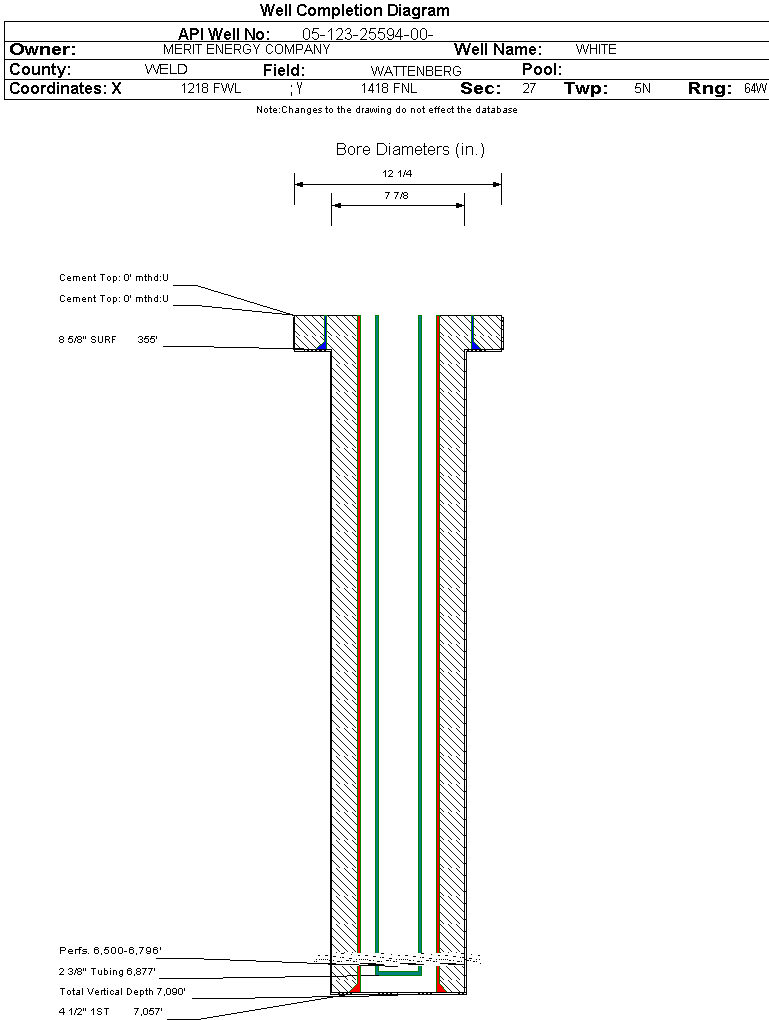 | Wellbore Completed | | Completion Date: | 1/9/2005 | | Spud Date: | 12/21/2004 | Spud Date Is: | ACTUAL | | Measured TD: | 7090 ft. | Measured PB depth: | | | True Vertical TD: | | True Vertical PB depth: | | | Log Types: | CR/CBL/CNL/DIL | | Casing: | String Type: SURF, Hole Size: 12.25 in., Size: 8.625 in., Top: 0 ft., Depth: 355 ft., Weight: 24 , Citings Type: ACTUAL | | Cement: | Sacks: 330, Top: 0 ft., Bottom: 355 ft., Determination Method: VISU | | Casing: | String Type: 1ST, Hole Size: 7.875 in., Size: 4.5 in., Top: 0 ft., Depth: 7057 ft., Weight: 11.6 , Citings Type: ACTUAL | | Cement: | Sacks: 525, Top: 0 ft., Bottom: 7057 ft., Determination Method: CBL | | Formation | Interval Top | Log Bottom | Cored | DSTs | | SUSSEX | 4200 ft. | | N | N | | SHANNON | 4876 ft. | | N | N | | NIOBRARA | 6490 ft. | | N | N | | FORT HAYS | 6759 ft. | | N | N | | CODELL | 6783 ft. | | N | N |