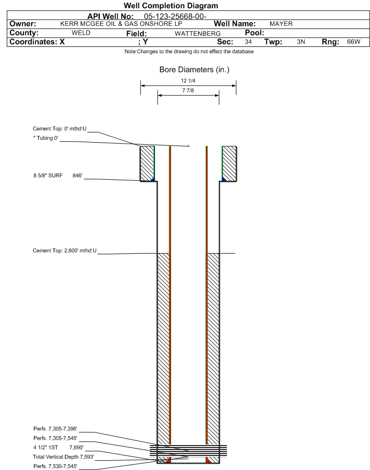 | | Perforation Data: | | Interval Top: | 7305 ft. | # Of Holes: | 120 | | Interval Bottom: | 7545 ft. | Hole Size: | 0.38 in. |
