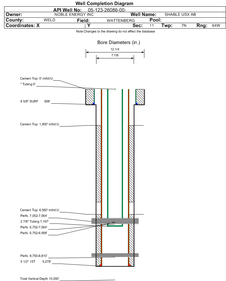 | | Perforation Data: | | Interval Top: | 6752 ft. | # Of Holes: | 120 | | Interval Bottom: | 7064 ft. | Hole Size: | |