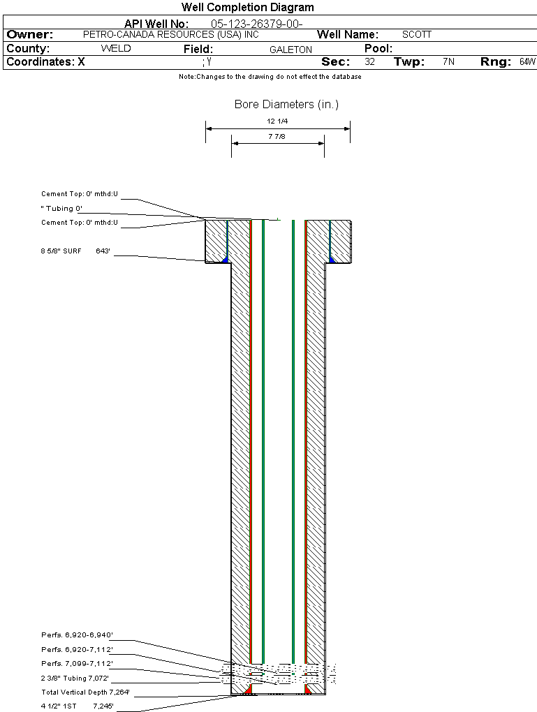 | Wellbore Completed | | Completion Date: | 5/23/2008 | | Spud Date: | 5/17/2008 | Spud Date Is: | ACTUAL | | Measured TD: | 7264 ft. | Measured PB depth: | 7206 ft. | | True Vertical TD: | | True Vertical PB depth: | | | Log Types: | SONIC BOND/GR, COMP DENS&NEUTRN/GR, DUAL IND./GR | | Casing: | String Type: SURF, Hole Size: 12.25 in., Size: 8.625 in., Top: 0 ft., Depth: 643 ft., Weight: 24 , Citings Type: ACTUAL | | Cement: | Sacks: 245, Top: 0 ft., Bottom: 643 ft., Determination Method: VISU | | Casing: | String Type: 1ST, Hole Size: 7.875 in., Size: 4.5 in., Top: 0 ft., Depth: 7246 ft., Weight: 11.6 , Citings Type: ACTUAL | | Cement: | Sacks: 1172, Top: 590 ft., Bottom: 7246 ft., Determination Method: CBL | | Formation | Interval Top | Log Bottom | Cored | DSTs | | PARKMAN | 3769 ft. | 4151 ft. | N | N | | SUSSEX | 4506 ft. | 4707 ft. | N | N | | SHANNON | 5121 ft. | 5211 ft. | N | N | | NIOBRARA | 6775 ft. | 7051 ft. | N | N | | CODELL | 7098 ft. | 7114 ft. | N | N |