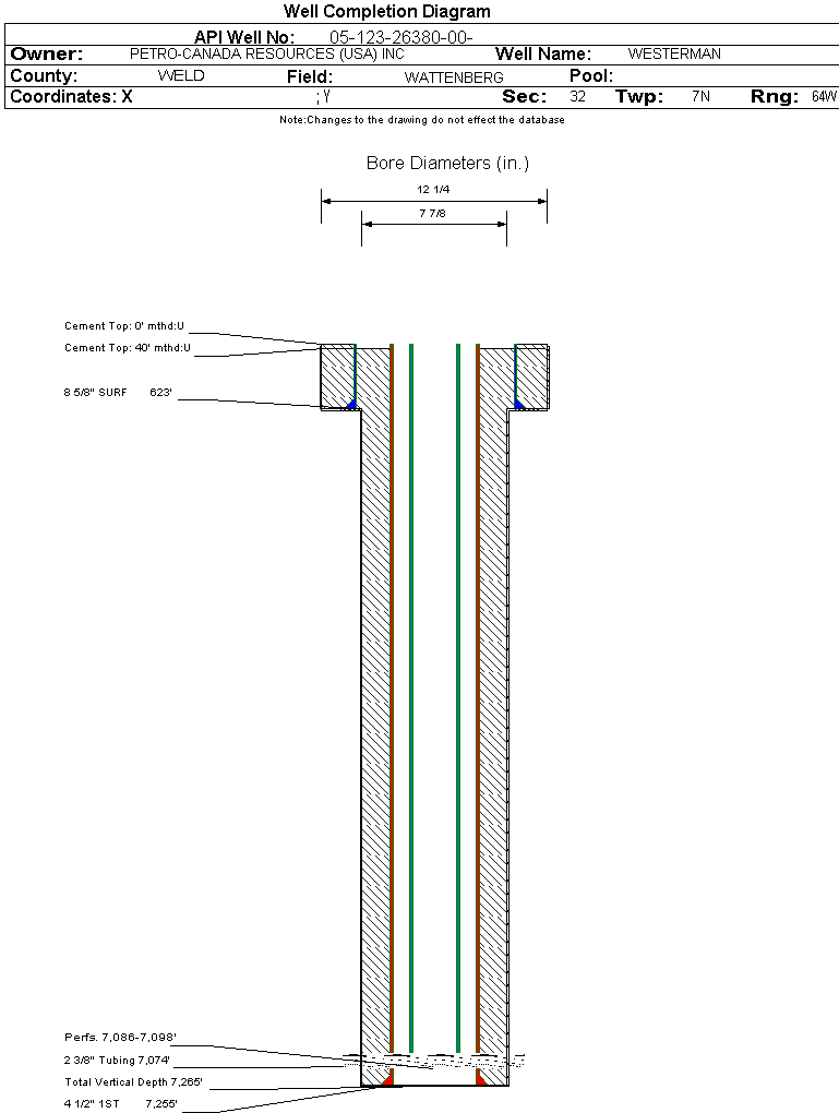 Wellbore #00 Wellbore Classification: OW Status: PA - 6/12/2023 Measured TD: 7265 ft.| Wellbore Data for Original Wellbore | Wellbore Classification: OW PA - 6/12/2023 | | Wellbore Permit | | | Permit #: | 20074306 | Expiration Date: | 10/2/2008 | | Proposed Depth/Form: | 7300 ft. | | Surface Mineral Owner Same: | No | | Mineral Owner: | FEE | Surface Owner: | FEE | | Unit: | | Unit Number: | | | Formation And Spacing: | Code: NB-CD , Formation: NIOBRARA-CODELL , Order: 407-87 , Unit Acreage: 80, Drill Unit: E/2NE |