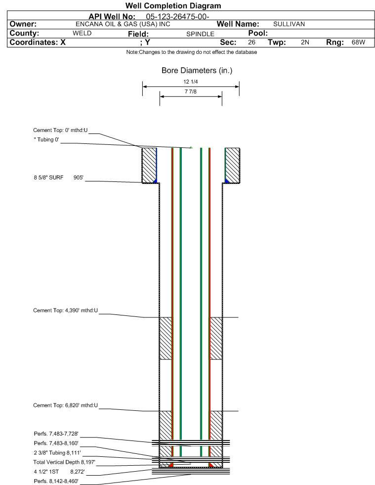 Wellbore #00 Wellbore Classification: GW Status: AB - 9/17/2024 Measured TD: 8285 ft. Vertical TD: 8197 ft.| Wellbore Data for Original Wellbore | Wellbore Classification: GW AB - 9/17/2024 | | Wellbore Permit | DIRECTIONAL | | Permit #: | 20073904 | Expiration Date: | 10/24/2008 | | Proposed Top PZ Location: | Sec: Twp: | Footage: 1345 FSL 50 FEL | | Bottom Hole Location: | Sec:26 Twp: 2N 68W | Footage: 1345 FSL 50 FEL | | Proposed Depth/Form: | 8264 ft. | | Surface Mineral Owner Same: | No | | Mineral Owner: | FEE | Surface Owner: | FEE | | Unit: | | Unit Number: | | | Formation And Spacing: | Code: CODL , Formation: CODELL , Order: 407, 407-6, Unit Acreage: 160, Drill Unit: E2SE | | Formation And Spacing: | Code: DKTA , Formation: DAKOTA , Order: , Unit Acreage: 160, Drill Unit: E2SE | | Formation And Spacing: | Code: JSND , Formation: J SAND , Order: , Unit Acreage: 160, Drill Unit: E2SE | | Formation And Spacing: | Code: NBRR , Formation: NIOBRARA , Order: 407 , Unit Acreage: 160, Drill Unit: E2SE | | Casing: | String Type: STAGE TOOL, Hole Size: , Size: , Top: , Depth: 5240 ft., Weight: , Citings Type: PLANNED | | Cement: | Sacks: 200, Top: 4390 ft., Bottom: 5240 ft. |