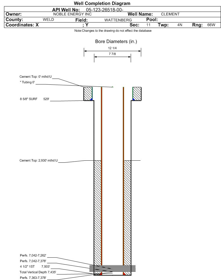 Wellbore #00 Wellbore Classification: GW Status: SI - 1/1/2025 Measured TD: 7520 ft. Vertical TD: 7435 ft.| Wellbore Data for Original Wellbore | Wellbore Classification: GW SI - 1/1/2025 | | Wellbore Permit | DIRECTIONAL | | Permit #: | 20075043 | Expiration Date: | 10/29/2008 | | Proposed Top PZ Location: | Sec:11 Twp: 4N 66W | Footage: 2609 FSL 58 FWL | | Bottom Hole Location: | Sec:11 Twp: 4N 66W | Footage: 2609 FSL 58 FWL | | Proposed Depth/Form: | 7455 ft. | | Surface Mineral Owner Same: | No | | Mineral Owner: | FEE | Surface Owner: | FEE | | Unit: | | Unit Number: | | | Formation And Spacing: | Code: NB-CD , Formation: NIOBRARA-CODELL , Order: 318A , Unit Acreage: 160, Drill Unit: GWA |