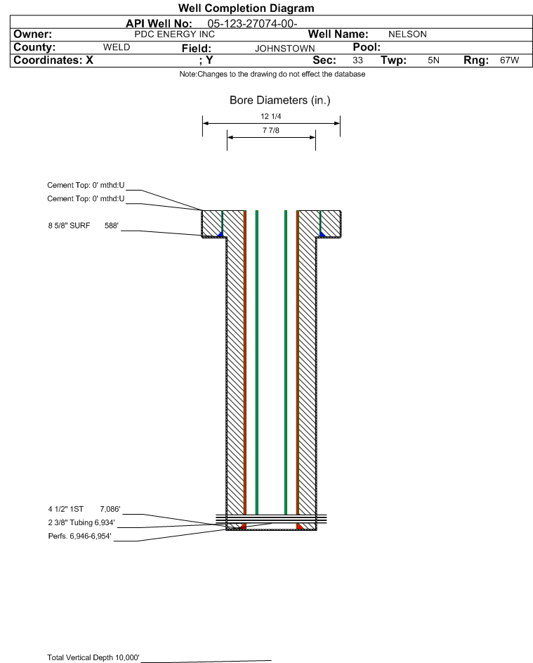 | Wellbore Completed | | Completion Date: | 12/8/2008 | | Spud Date: | 12/4/2008 | Spud Date Is: | ACTUAL | | Measured TD: | 7112 ft. | Measured PB depth: | 7047 ft. | | True Vertical TD: | | True Vertical PB depth: | | | Log Types: | CBL, CNL/CDL, DUAL INDUCTION | | Casing: | String Type: SURF, Hole Size: 12.25 in., Size: 8.625 in., Top: 0 ft., Depth: 588 ft., Weight: 24 , Citings Type: ACTUAL | | Cement: | Sacks: 420, Top: 0 ft., Bottom: 588 ft., Determination Method: VISU | | Casing: | String Type: 1ST, Hole Size: 7.875 in., Size: 4.5 in., Top: 0 ft., Depth: 7086 ft., Weight: 11.6 , Citings Type: ACTUAL | | Cement: | Sacks: 835, Top: 0 ft., Bottom: 7086 ft., Determination Method: CBL | | Formation | Interval Top | Log Bottom | Cored | DSTs | | NIOBRARA | 6630 ft. | | N | N | | FORT HAYS | 6920 ft. | | N | N | | CODELL | 6940 ft. | | N | N |