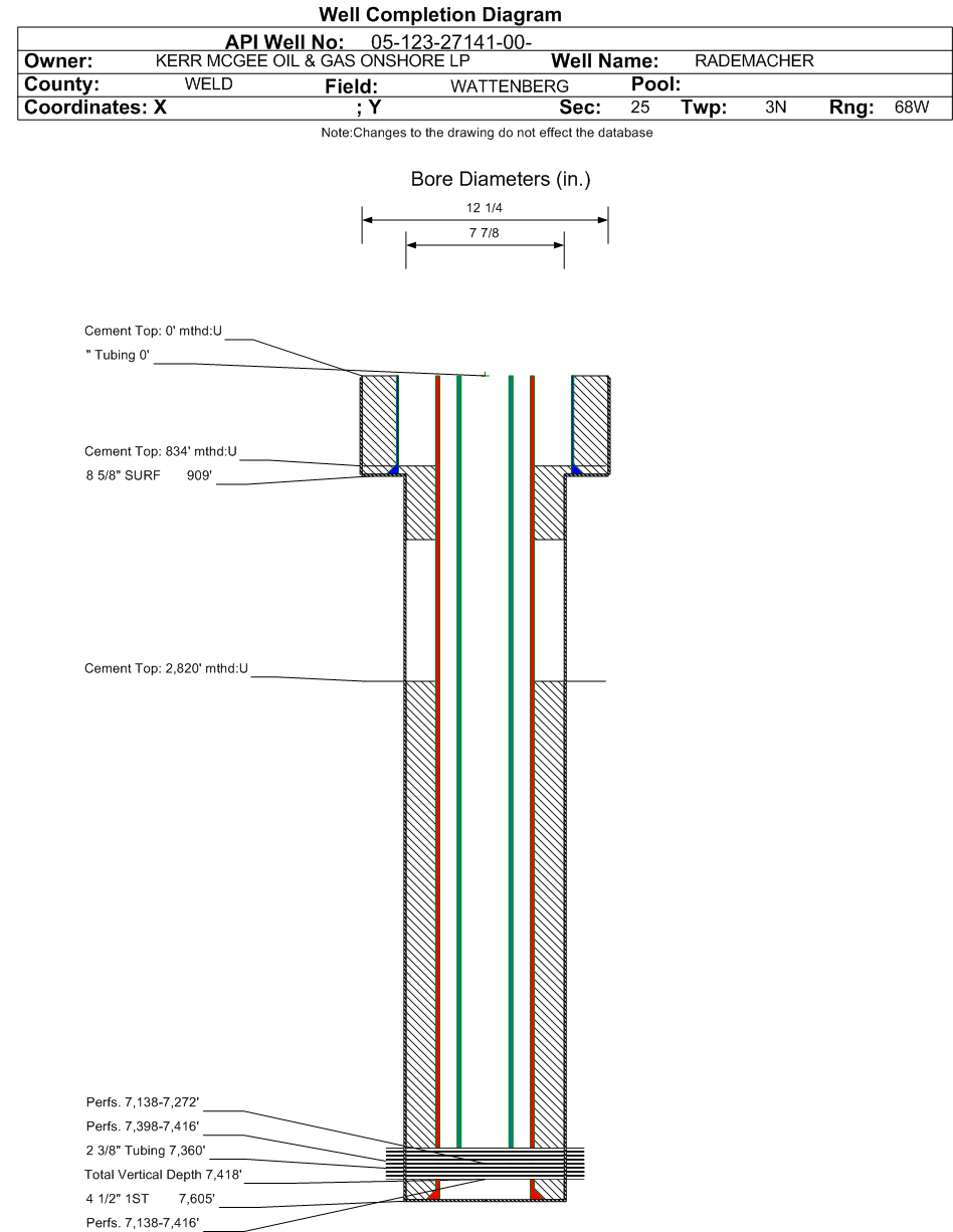 | | Perforation Data: | | Interval Top: | 7398 ft. | # Of Holes: | 54 | | Interval Bottom: | 7416 ft. | Hole Size: | 0.38 in. |