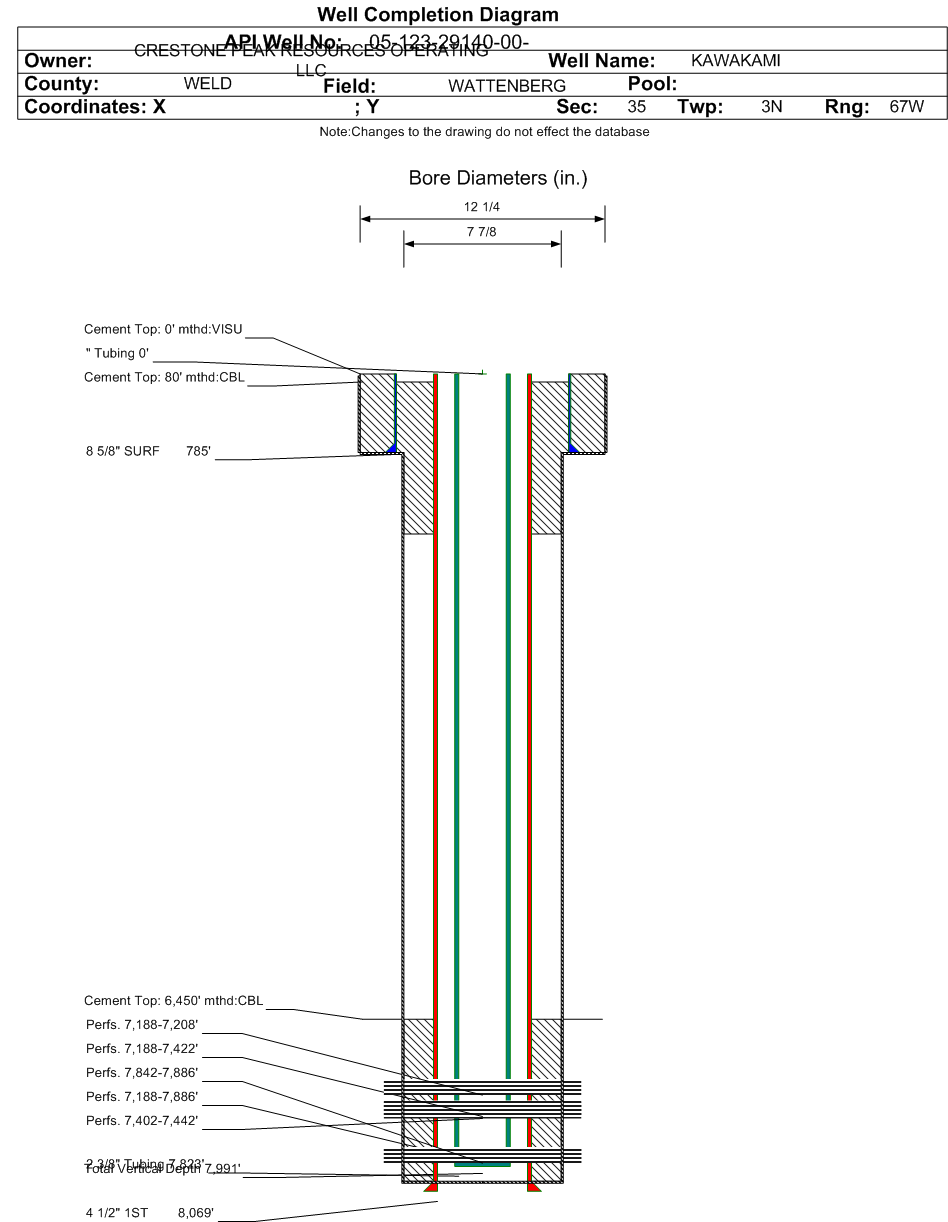 Wellbore #00 Wellbore Classification: GW Status: SI - 10/1/2021 Measured TD: 8075 ft. Vertical TD: 7991 ft.| Wellbore Data for Original Wellbore | Wellbore Classification: GW SI - 10/1/2021 | | Wellbore Permit | DIRECTIONAL | | Permit #: | 20084940 | Expiration Date: | 10/6/2009 | | Proposed Top PZ Location: | Sec:35 Twp: 3N 67W | Footage: 1313 FNL 2479 FEL | | Bottom Hole Location: | Sec:35 Twp: 3N 67W | Footage: 1313 FNL 2479 FEL | | Proposed Depth/Form: | 7990 ft. | | Surface Mineral Owner Same: | Yes | | Mineral Owner: | FEE | Surface Owner: | FEE | | Unit: | | Unit Number: | | | Formation And Spacing: | Code: CODL , Formation: CODELL , Order: 407, 407-6, Unit Acreage: 160, Drill Unit: GWA | | Formation And Spacing: | Code: JSND , Formation: J SAND , Order: 232 , Unit Acreage: 160, Drill Unit: GWA | | Formation And Spacing: | Code: NBRR , Formation: NIOBRARA , Order: 407 , Unit Acreage: 160, Drill Unit: GWA |
