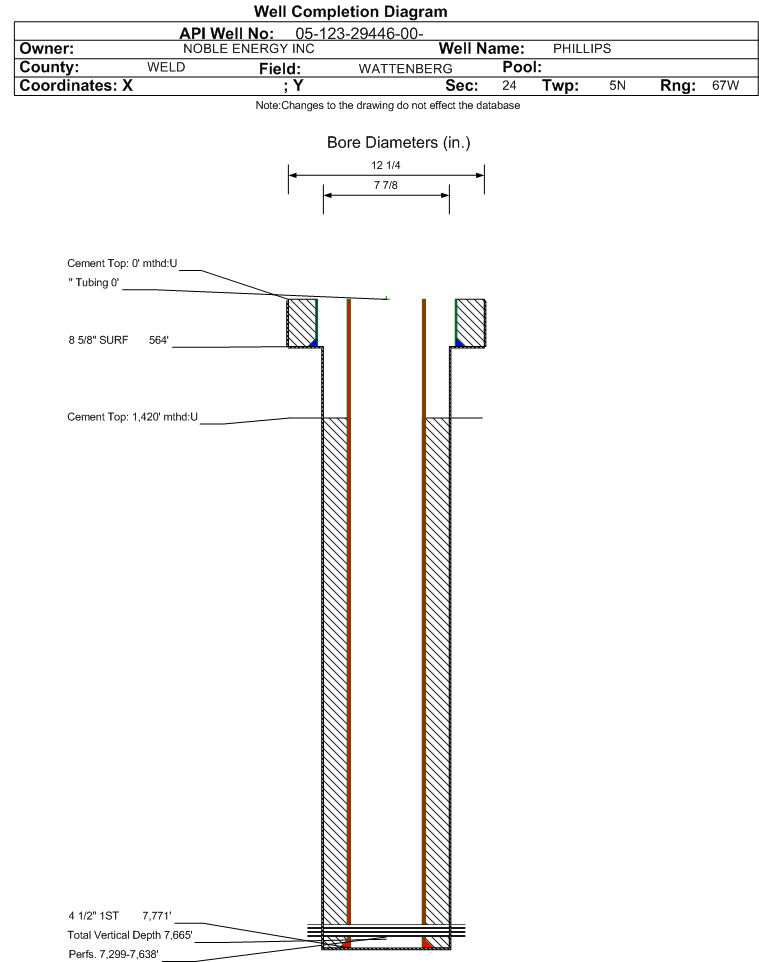 Wellbore #00 Wellbore Classification: OW Status: AB - 9/4/2024 Measured TD: 7781 ft. Vertical TD: 7665 ft.| Wellbore Data for Original Wellbore | Wellbore Classification: OW AB - 9/4/2024 | | Wellbore Permit | DIRECTIONAL | | Permit #: | | Expiration Date: | 11/12/2012 | | Proposed Top PZ Location: | Sec:24 Twp: 5N 67W | Footage: 1302 FSL 2548 FWL | | Bottom Hole Location: | Sec:24 Twp: 5N 67W | Footage: 1302 FSL 2548 FWL | | Proposed Depth/Form: | 7753 ft. | | Surface Mineral Owner Same: | Yes | | Mineral Owner: | FEE | Surface Owner: | FEE | | Unit: | | Unit Number: | | | Formation And Spacing: | Code: CODL , Formation: CODELL , Order: 407-87 , Unit Acreage: 160, Drill Unit: GWA | | Formation And Spacing: | Code: NB-CD , Formation: NIOBRARA-CODELL , Order: 407-87 , Unit Acreage: 160, Drill Unit: GWA | | Formation And Spacing: | Code: NBRR , Formation: NIOBRARA , Order: 407-87 , Unit Acreage: 160, Drill Unit: GWA | | Casing: | String Type: SURF, Hole Size: 12.25 in., Size: 8.625 in., Top: , Depth: 510 ft., Weight: 24 , Citings Type: PLANNED | | Cement: | Sacks: 210, Top: 0 ft., Bottom: 510 ft. | | Casing: | String Type: 1ST, Hole Size: 7.875 in., Size: 4.5 in., Top: , Depth: 7753 ft., Weight: 11.6 , Citings Type: PLANNED | | Cement: | Sacks: 732, Top: , Bottom: 7753 ft. |