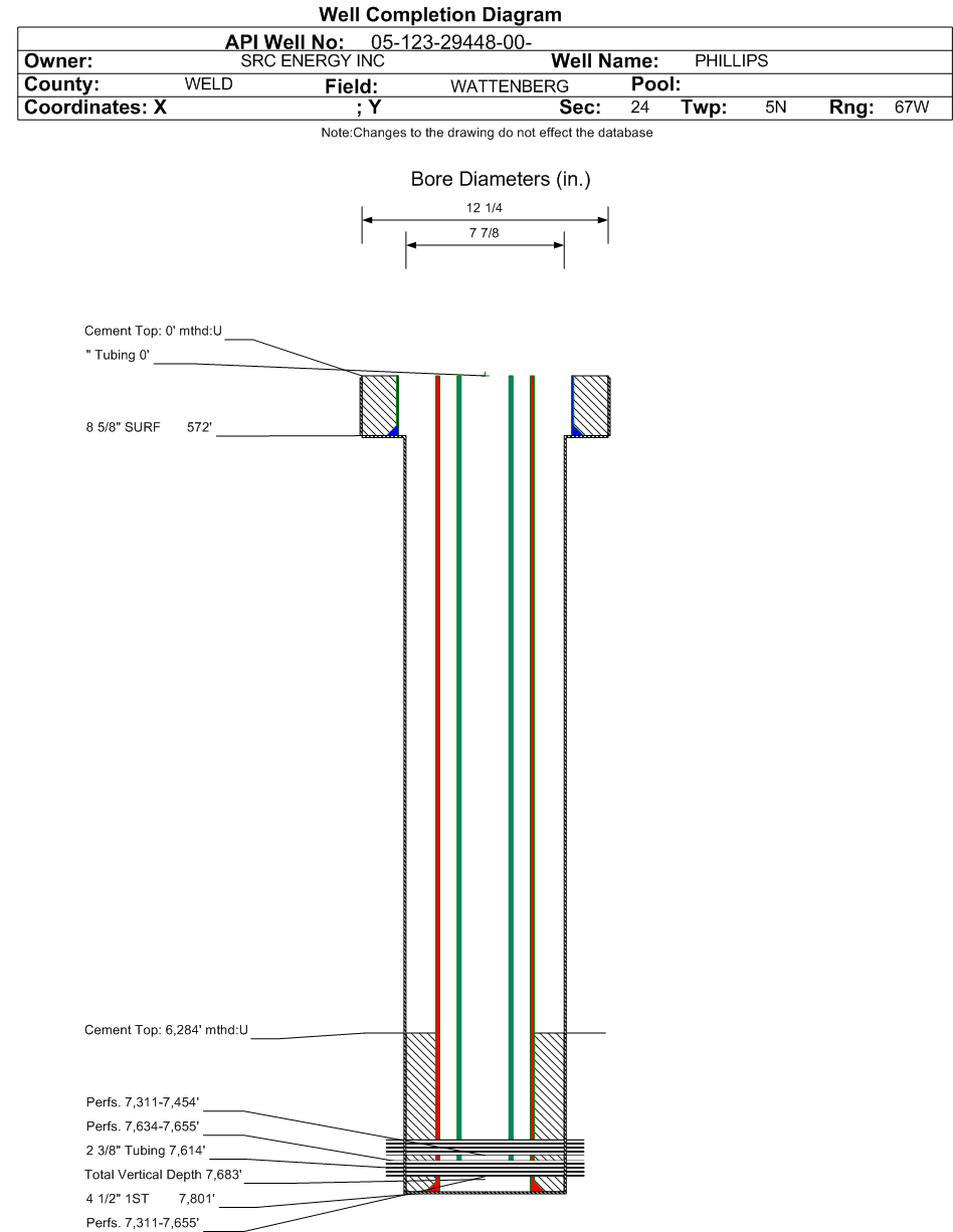 | Wellbore Completed | | Completion Date: | 6/24/2011 | | Spud Date: | 6/21/2011 | Spud Date Is: | ACTUAL | | Measured TD: | 7811 ft. | Measured PB depth: | 7758 ft. | | True Vertical TD: | 7683 ft. | True Vertical PB depth: | 7630 ft. | | Top PZ Location: | Sec:24 Twp: 5N 67W | Footage: 81 FSL 1280 FWL | | Bottom Hole Location: | Sec:24 Twp: 5N 67W | Footage: 80 FSL 1346 FWL | | Log Types: | CBL, DIL | | Casing: | String Type: SURF, Hole Size: 12.25 in., Size: 8.625 in., Top: 0 ft., Depth: 572 ft., Weight: 24 , Citings Type: ACTUAL | | Cement: | Sacks: 214, Top: 0 ft., Bottom: 572 ft., Determination Method: VISU | | Casing: | String Type: 1ST, Hole Size: 7.875 in., Size: 4.5 in., Top: 0 ft., Depth: 7801 ft., Weight: 11.6 , Citings Type: ACTUAL | | Cement: | Sacks: 720, Top: 6284 ft., Bottom: 7801 ft., Determination Method: CBL | | Formation | Interval Top | Log Bottom | Cored | DSTs | | PIERRE | 2819 ft. | | | | | PARKMAN | 3844 ft. | | | | | SUSSEX | 4581 ft. | | | | | SHANNON | 5007 ft. | | | | | NIOBRARA | 7291 ft. | | | | | FORT HAYS | 7611 ft. | | | | | CODELL | 7633 ft. | | | |